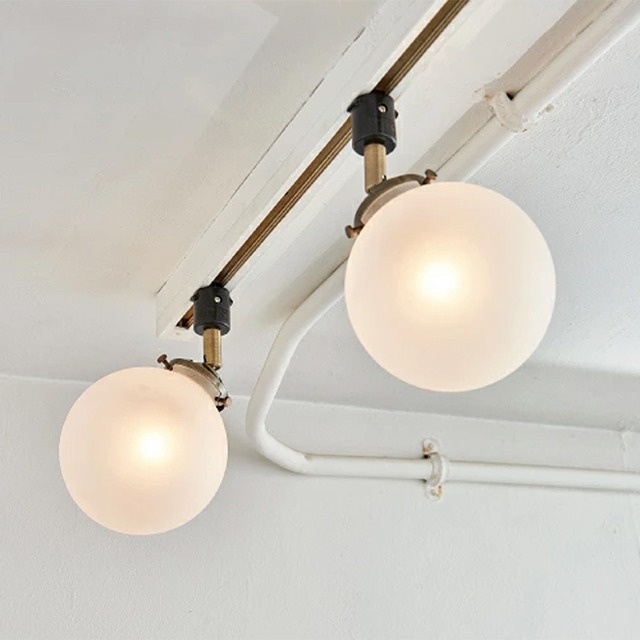 アンティークな風合いで手のひらで包めるほどの小ぶりなガラスセードがダクトレールライトになりました。懐かしさを感じるレトロなデザインで、キッチンやダイニングなどでの複数使いもおすすめです。アンティークゴールドのソケットを採用し、レトロなテイストに仕上げており、セードの角度を変えてお好きな場所を照らすことができるので、シーンに合わせた用途でお楽しみいただけます。ガラスセードのスポットライトの魅力は天井へも光が漏れ、影模様を生み出すところ。厚みのあるハンドメイドガラスを通して陽だまりのようにあたたかな光が広がります。ライティングレールに複数並べると明るく華やかな印象になるので、メイン照明としてもお使いいただけるダクトレールライトです。