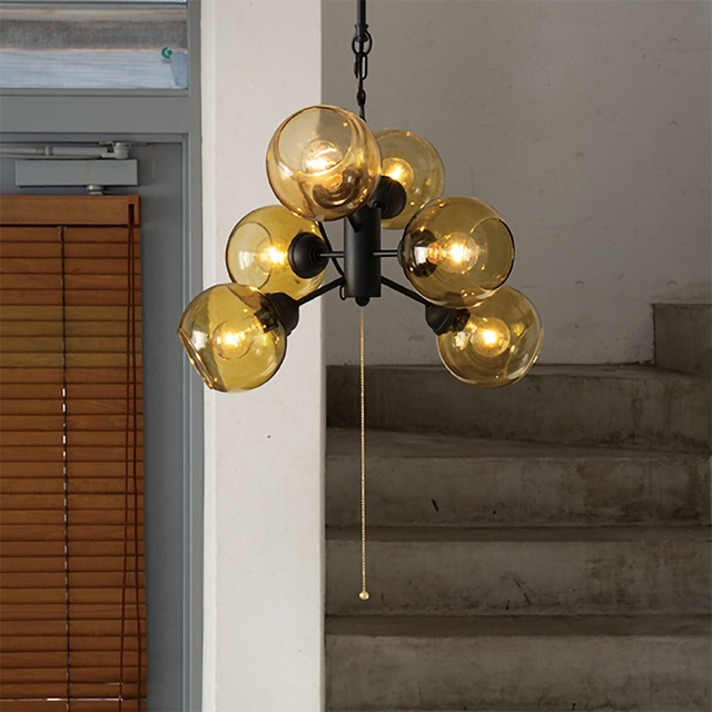 インダストリアルな印象とヨーロピアンテイストが融合されたペンダントガラスランプ。 1つ1つ手作りのガラスが温かみのある風合いを出してくれる照明です。中央の柱はブラックのでこぼこしたエイジング塗装を施しており、6つの枝が出ているかのようなソケットには、アンバー色のグラスを被せ幻想的な光を演出します。6灯で明るさも確保できるのが特徴の照明です。デザイン照明なので、灯りがついていない時もインテリアとしてお楽しみいただけます。