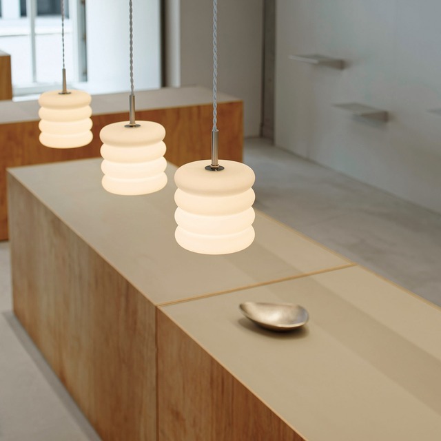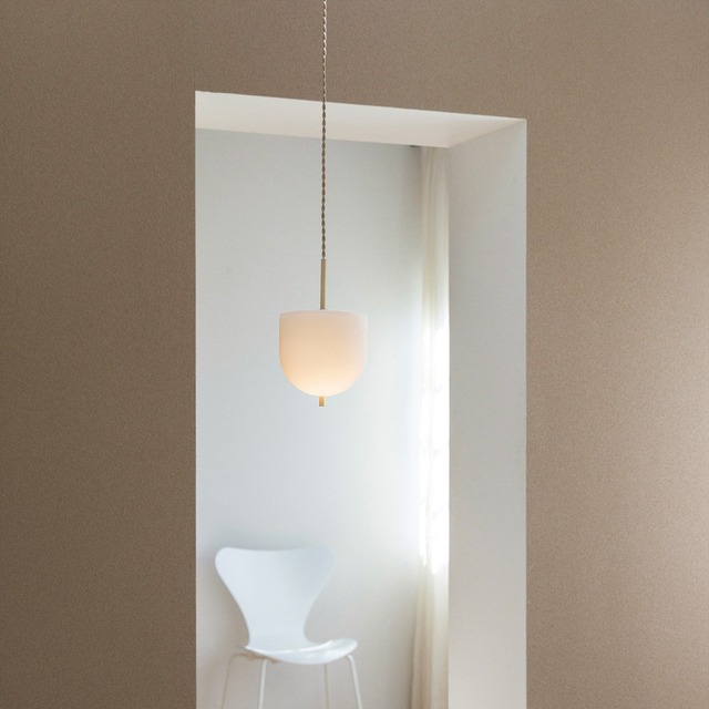 直線的なポールと丸みを帯びたセードを組み合わせた、独楽のように均衡の取れた形状が落ち着きと静けさを感じさせます。ソケットカバーなどの機械的な部分を見せないことでノイズが軽減され、まるで光が空中に浮かんでいるような印象を与えます。柔らかな光が広がるホワイトフロストガラスが眩しさを抑え、優しい灯りを提供します。ニュートラルでモダン、かつシンプルなルックスが空間を引き立てるペンダントライトです。