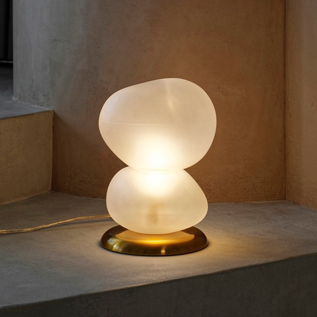 不規則で有機的なシルエットがアブストラクトアートを思わせるインテリア性の高いテーブルライト。アシンメトリーな二つのフォルムを半透明のフロストガラスで表現しています。ふわりとした明かりがかすかな輪郭を浮かび上がらせ、癒しのひとときを演出します。