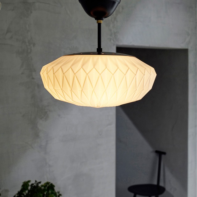 折り紙のような凹凸のあるハンドメイドによるホワイトガラスが柔らかな陰影を描く、モダンなペンダントライト。ボリュームのあるガラスセードを引き立てる無駄を削ぎ落したマットブラックのソケットが、凛としたシルエットを作ります。洋室にはもちろん和室にも合わせられる、シンプルでありながらも洗練されたデザインです。