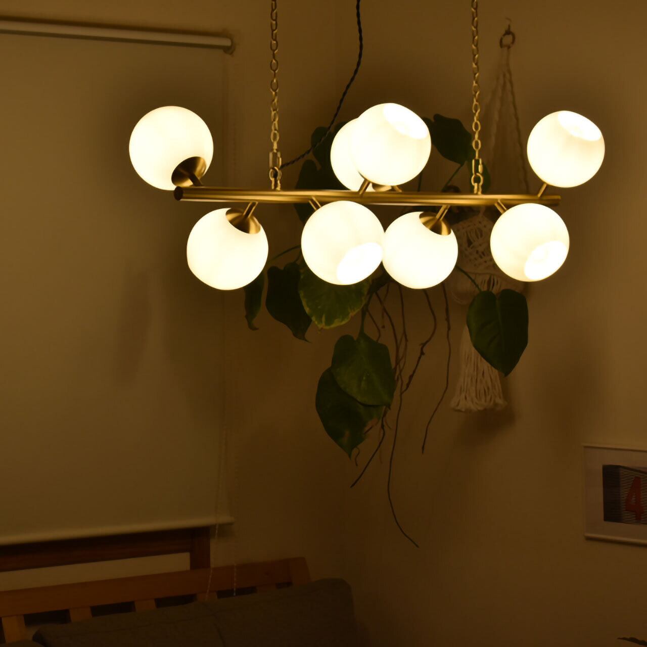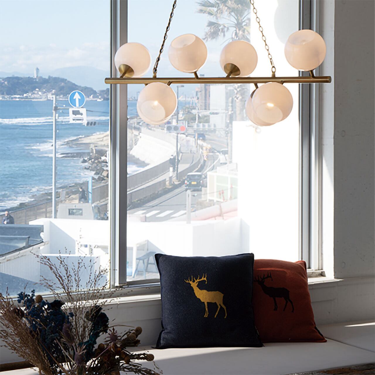 照明選びで大事にしたいのは、灯りが付いていないときでもおしゃれということ。ビアリッツ8は、8つのガラスシェードが四方を照らすダイナミックなペンダントランプ。灯りがついていなくても存在感があり、つい見とれてしまうような照明です。