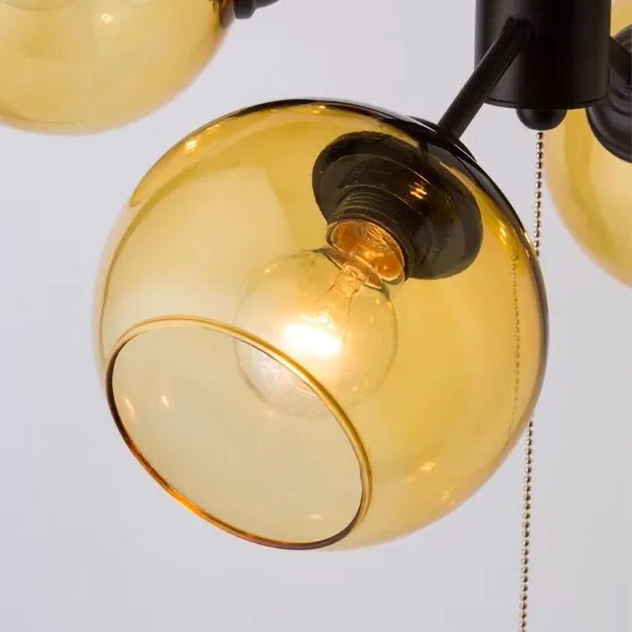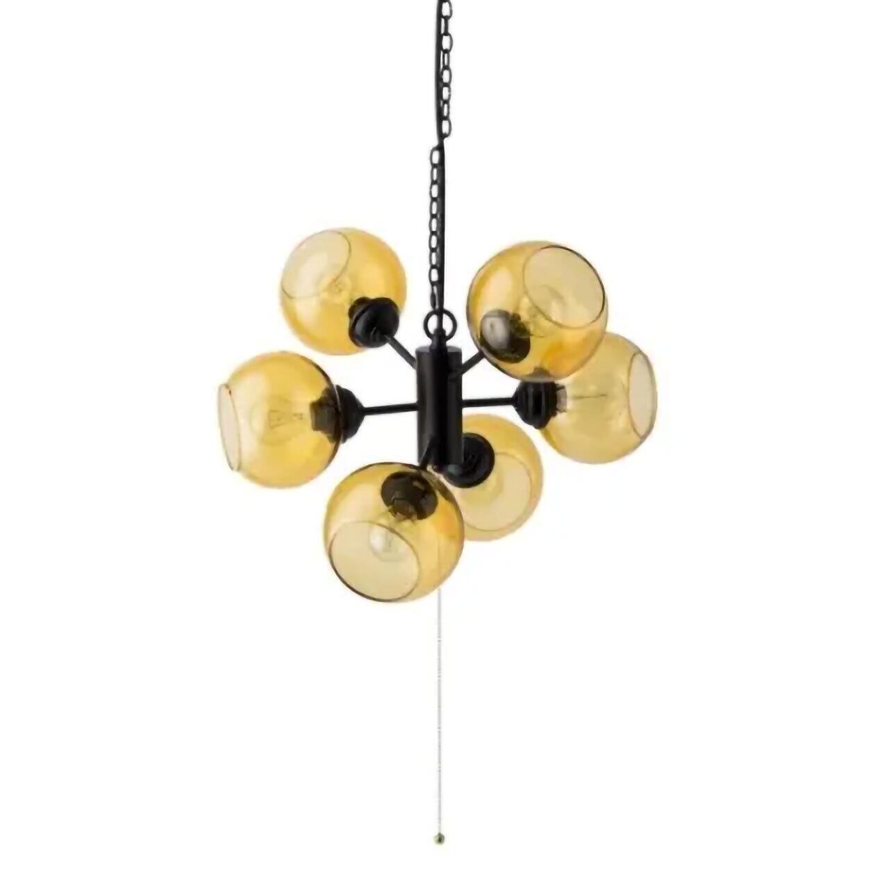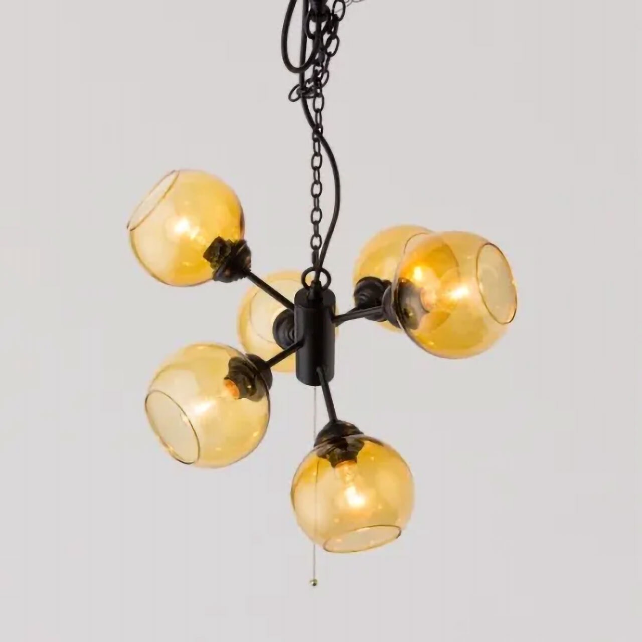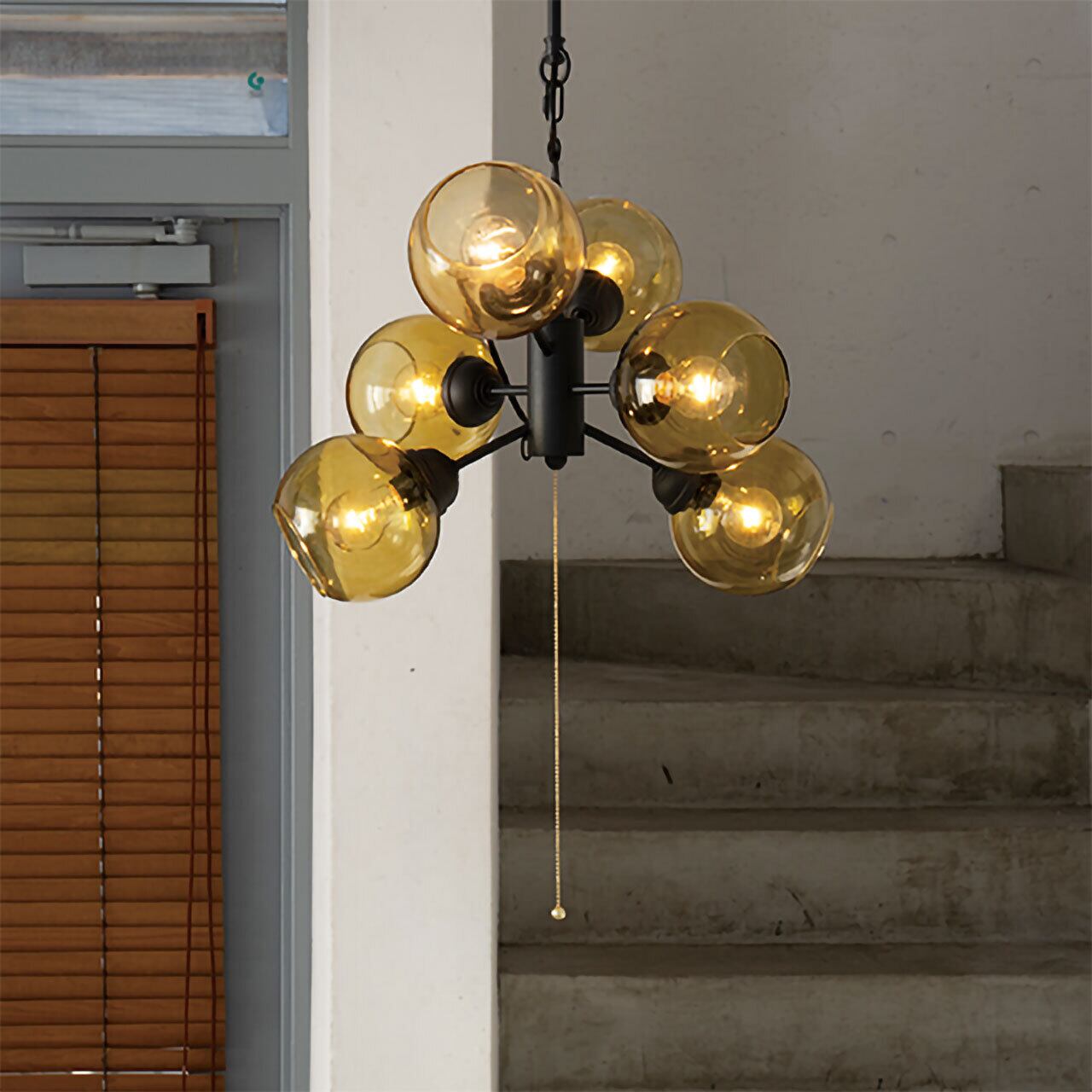 1つ1つ手作りのガラスが温かみのある風合いを出してくれる照明です。中央の柱はブラックのでこぼこしたエイジング塗装を施しており、6つの枝が出ているかのようなソケットには、アンバー色のグラスを被せ幻想的な光を演出します。6灯で明るさも確保できるのが特徴の照明です。デザイン照明なので、灯りがついていない時もインテリアとしてお楽しみいただけます。