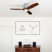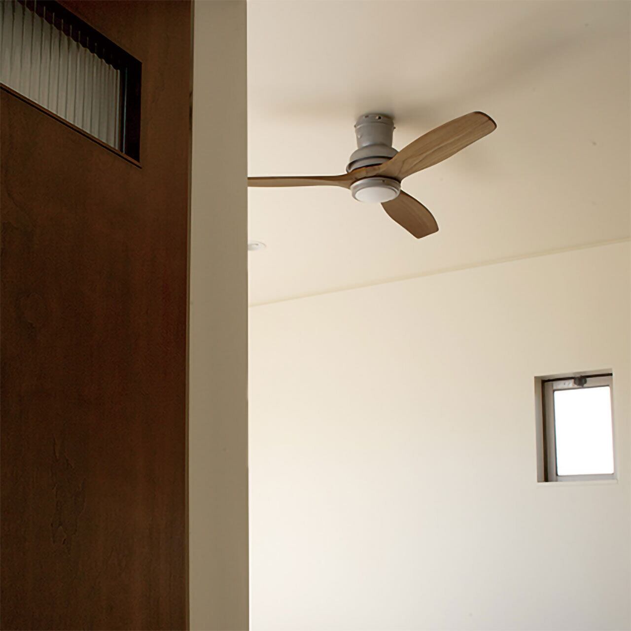 特徴はなんといっても全長を短くしたデザイン。天井高が低いお部屋でもご使用可能で、設置場所のバリエーションが広がります。柔らかい印象のウッドの羽と、無骨なアイアンのボディとの組み合わせが、異素材ですが調和のとれたデザインです。