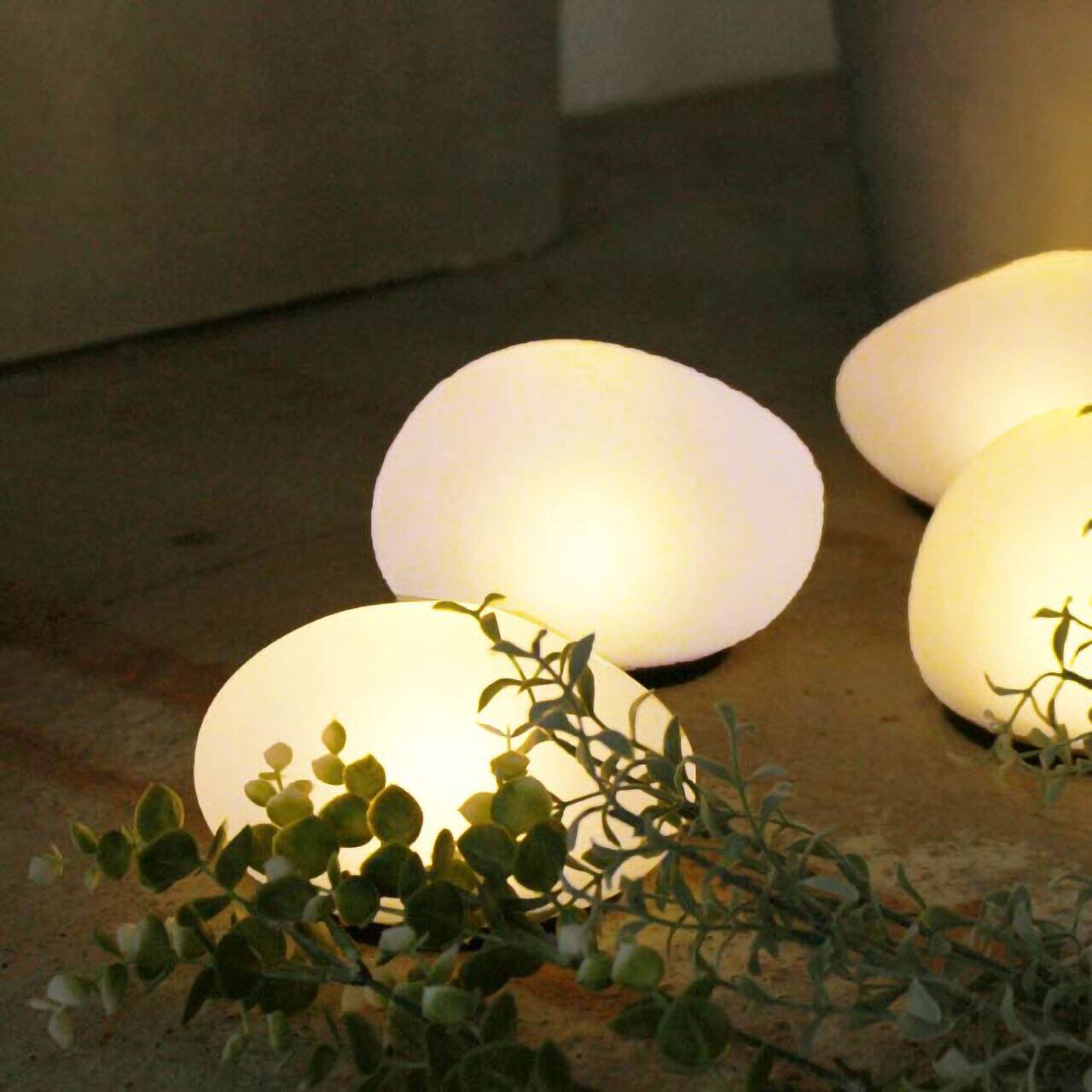 自然の光で充電する、センサー式ソーラーライト。石のカタチのLEDライトは太陽の光で充電し、暗くなると自動で点灯します。S・Lサイズの異なる大きさを並べるとより自然に近い石のカタチを再現できます。庭や玄関先にいくつか置くと、飛び石のように自然に溶け込みます。防滴(※2)かつコンセントのいらない電池式なので、屋外での使用が可能。庭石としてガーデニングにお使いいただくものおすすめです。