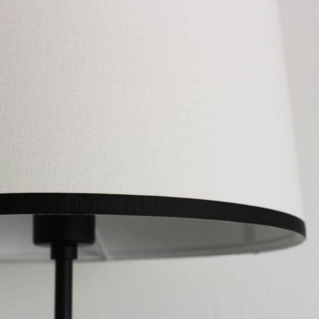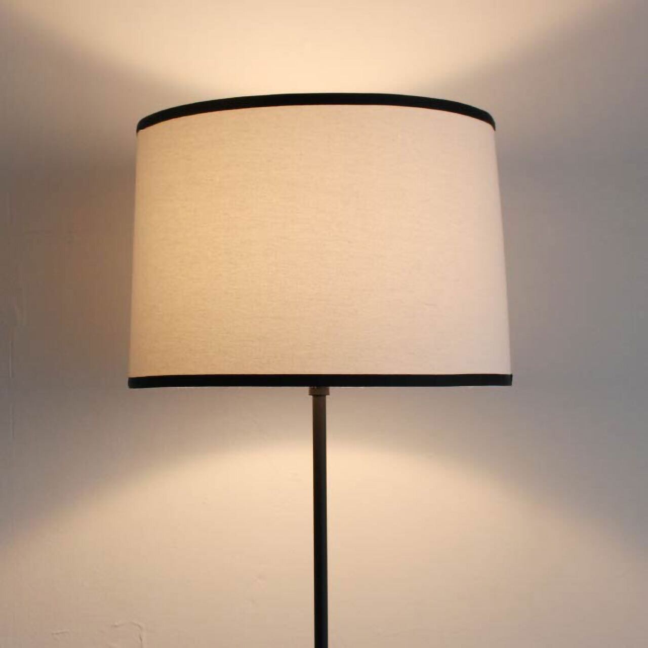 シェードにはぬくもりのあるファブリック (オフホワイト、グレー)を使用。点灯すると、シェードを通して柔らかい灯りが広がります。上下の縁の部分には、アクセントにテープを巻いており、ベースは、それぞれのシェードのカラーと相性のよい色を組み合わせて、シンプルながらも存在感のある照明に仕上げました。