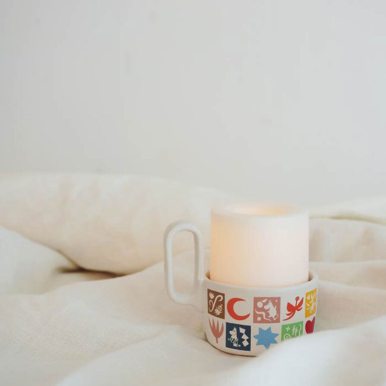 キャンドルを模したLEDユニットをマグカップをモチーフにデザインされたホルダーにセットして、愛らしく、あたたかく灯りを楽しむポータブルランプ。80周年を記念した特別なデザインのカラフルな80周年限定カラー。USB充電で場所を選ばす最長60時間連続使用可能。生活防滴仕様IP44で屋外や浴室に持ち込んでも楽しめます。北欧では「ヒュッゲ」というロウソクや間接照明、暖炉の灯りなど柔らかな灯りで居心地がいい空間や時間を過ごす文化があります。やさしく揺らぐ仄暗い灯りを囲みながらリラックスした時間をお過ごしください。