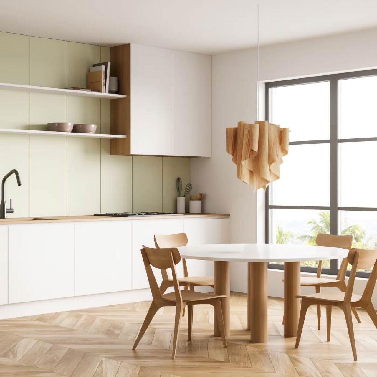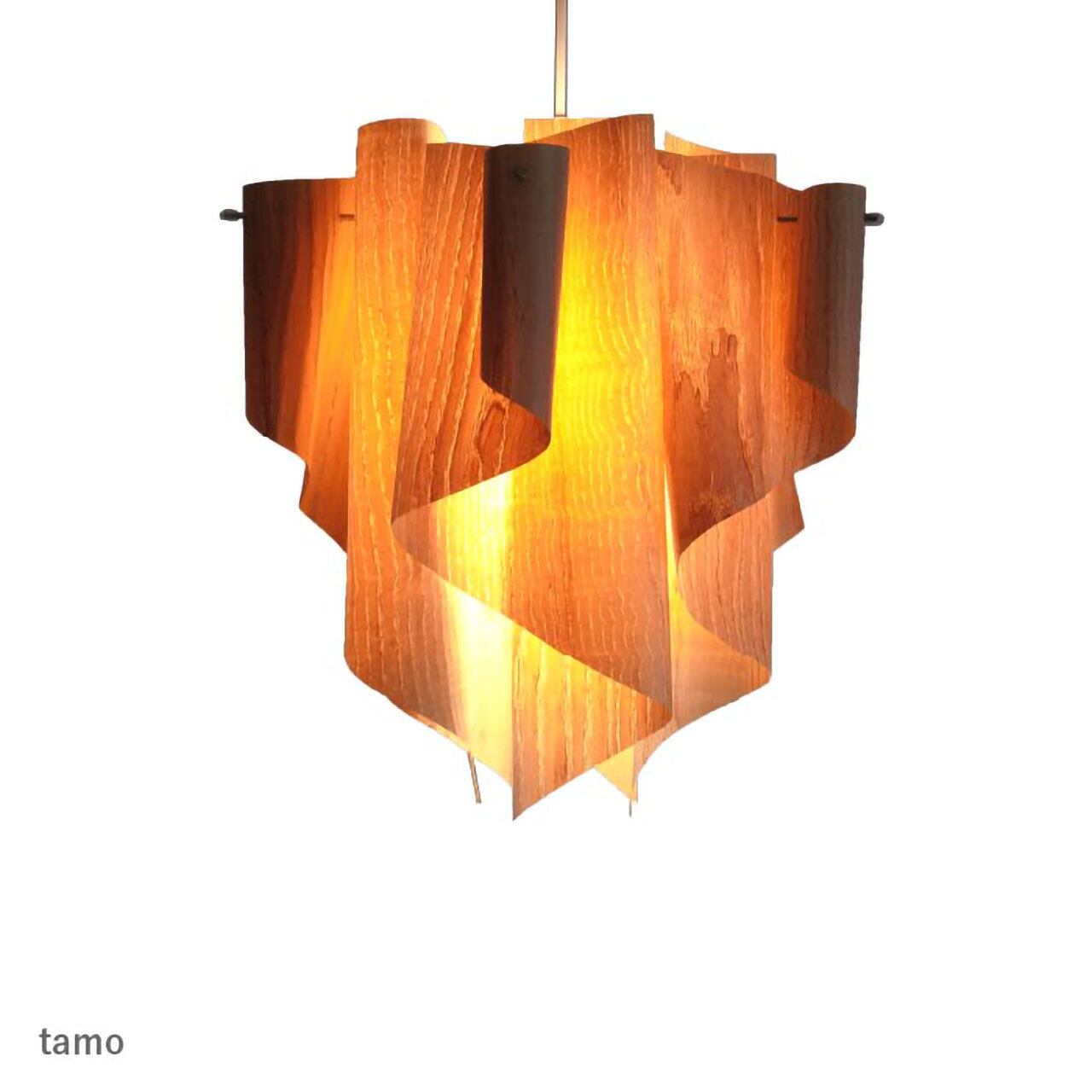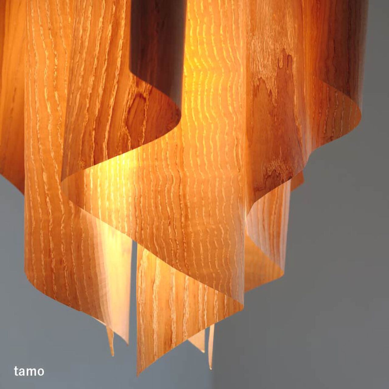 オーロラの美しいドレープをモチーフにしつつ、天然木を合わせて木の暖かみを感じさせる、異なる要素を組み合わせたデザイン。国産のサクラ材を使用し、美しい木目のシェードを透した光は、やわらかさとオレンジの色味を増し、空間にやすらぎを与えます。天然木を極薄にスライスし、特殊な下地加工をすることで、薄く軽やかなカーブを実現しています。木目に特徴のあるタモ材は、消灯時の木目も美しく、あかりをつけると優しい木の質感を反映した幻想的な空間を演出します。