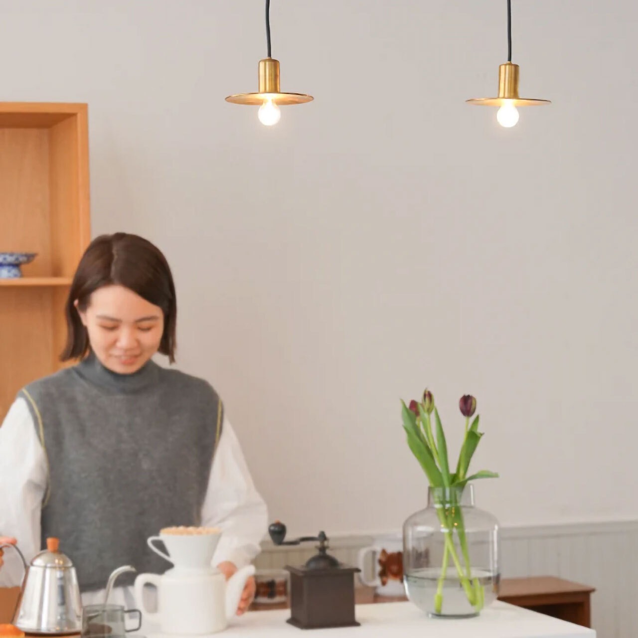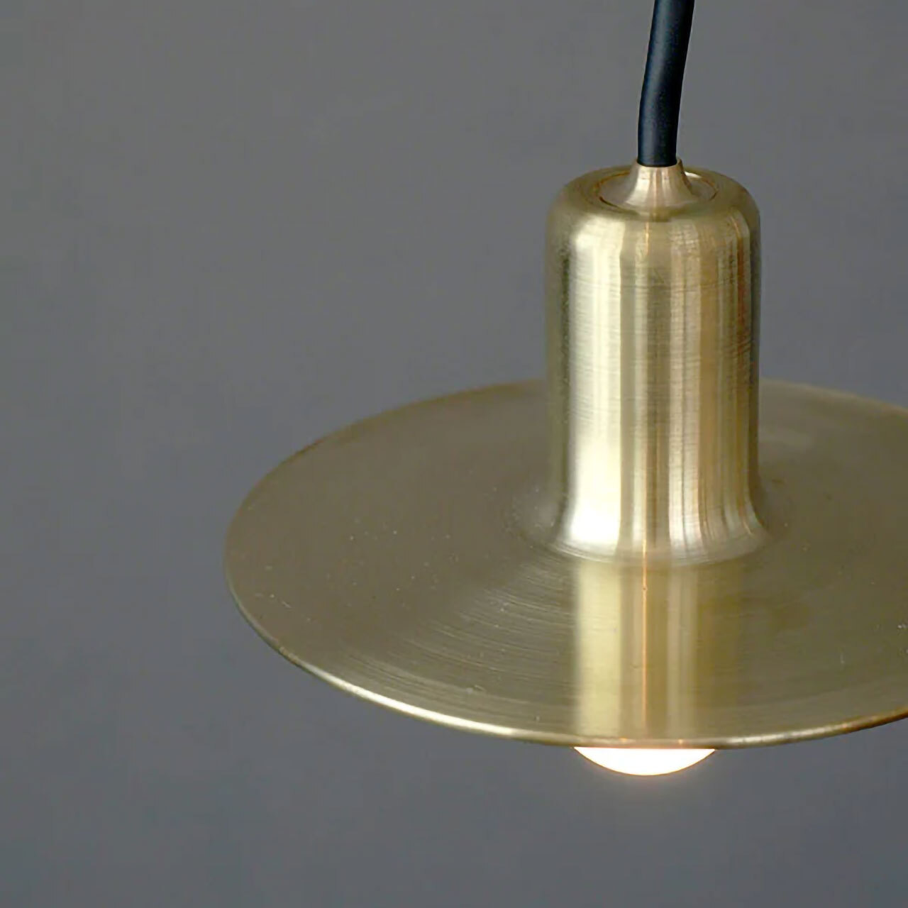 金属を用いた物作りを行うKITAWORKS主宰・木多隆志(きたたかし)氏と、AXCIS,INC.が共同開発をして生まれた”KT”シリーズ。”KT brass pendant light 60 ”は、シェードと灯具が一体型になったコンパクトな真鍮製ペンダントライトです。金属の板を伸ばして成形する”ヘラ絞り”という技術を使い、熟練の職人が一点一点手作業で製造しています。ぽってりとした厚さ約3mmの真鍮シェードはフチ部分に丸みを出し、金属なのに不思議と柔らかい空気感を持つシェイプに仕上げました。小ぶりな直径14cmのシェードは、玄関や洗面所などでは灯すようにひとつだけを吊るして。リビングや寝室などのリラックススペースで、椅子の近くに吊るして使用するのもおすすめです。キッチン・ダイニングなど幅のある場所で使用する場合は、複数個を並べて設置するとバランス良く収まります。