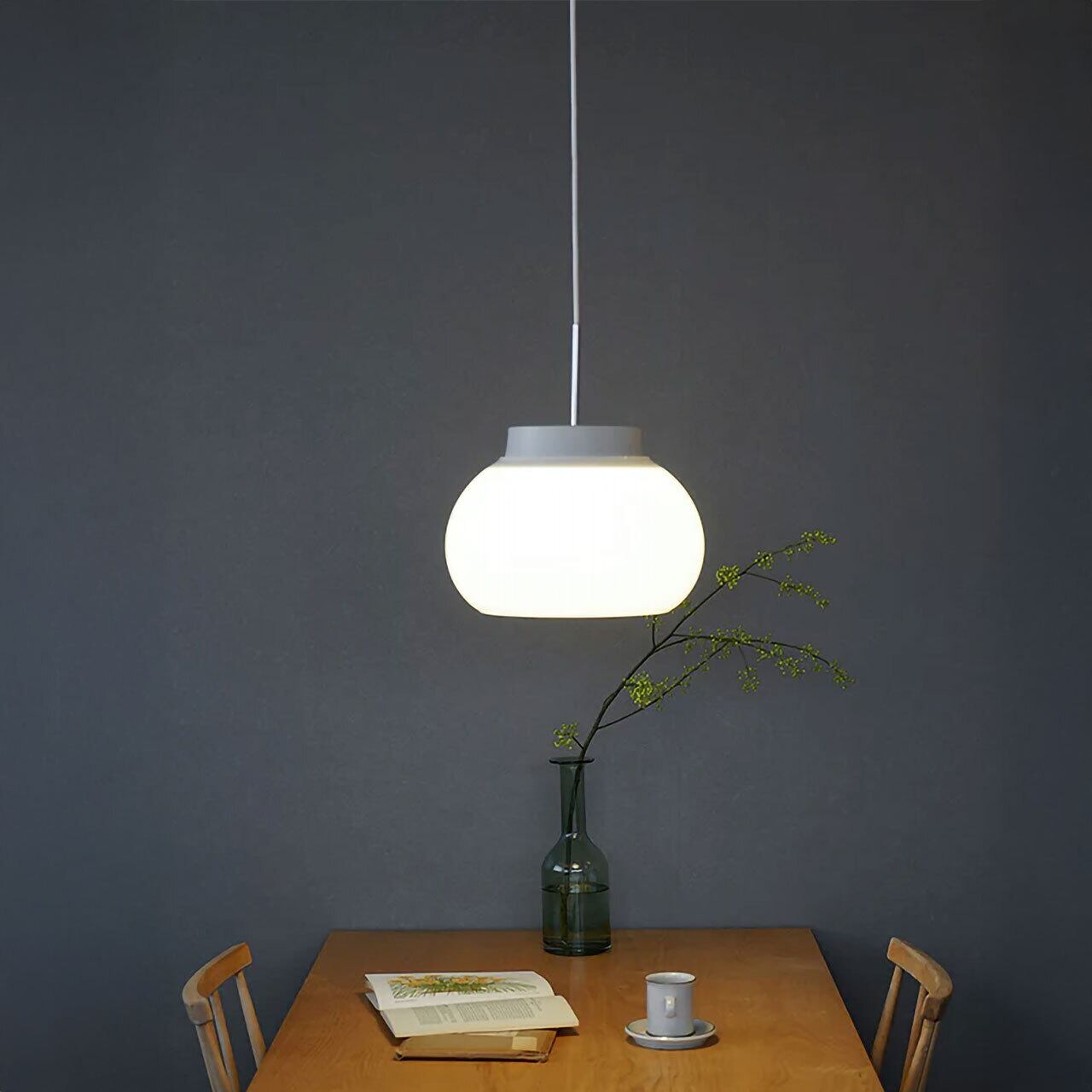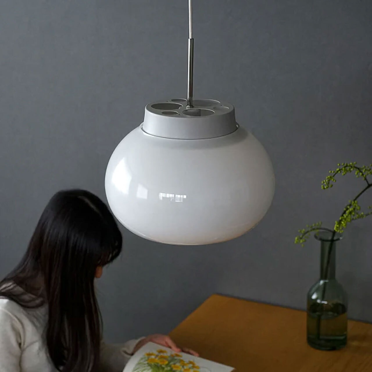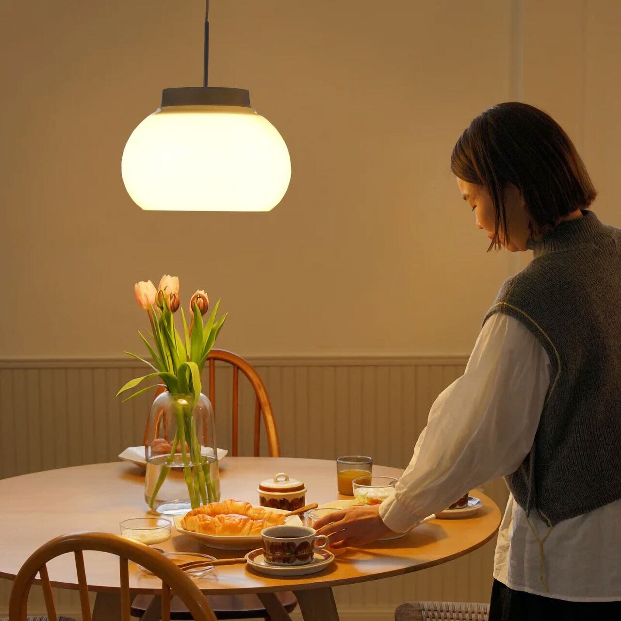 心地良いあかりを生み出す「kom(コム)」。ドイツ語の”komfort=快適・居心地”という言葉から名付けられた照明シリーズです。上下がオープンになったシェードは光が上下に抜けて、天井や手元を照らします。また、乳白ガラスは光を半透過するため、空間全体が穏やかなトーンで明るくなります。シェードや灯具の構造を工夫してあるので光源が直接目に入らず、不快な眩しさ=グレアを抑えた仕様になっています。ダイニングテーブルの上に吊るせば、ポッと灯るあかりが雰囲気良く、あたたかなムードの空間を演出してくれます。