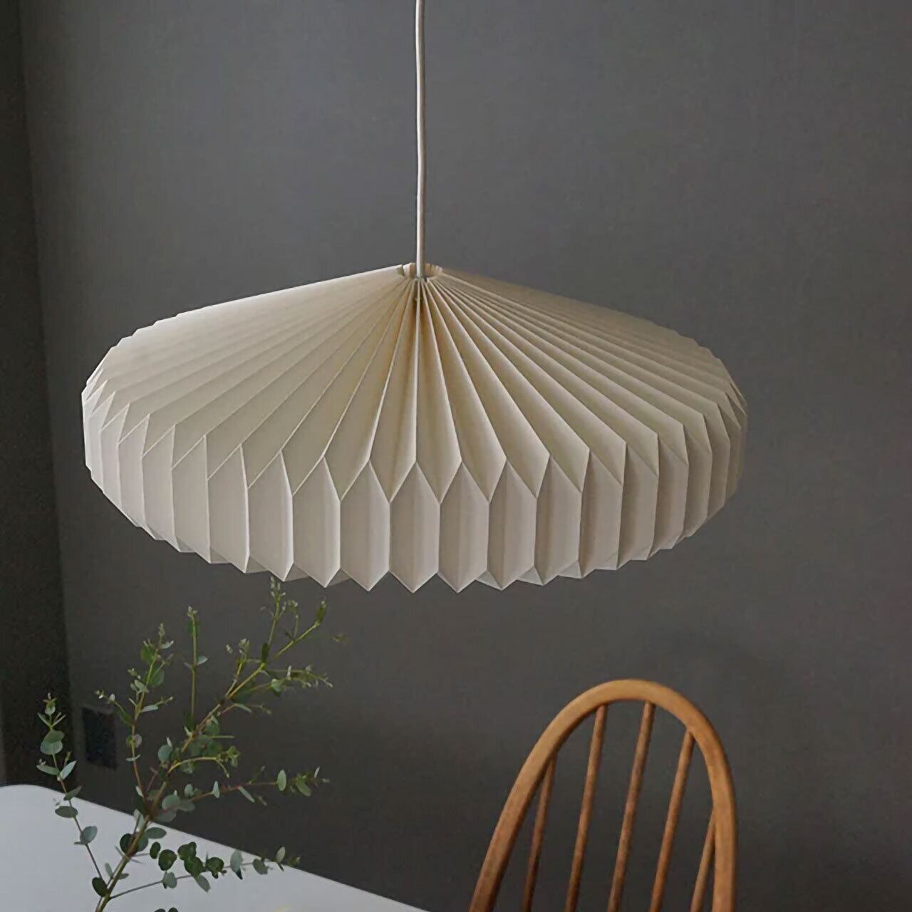 「月」を意味をする言葉「MNE(モーネ)」。モーネシリーズは紙を手で折り上げて、幾何学的なフォルムに仕立てたペンダントシェードです。オフホワイトがかった白色の紙シェードは、見た目や手触りはしっかりしながらも独特の温もり感があります。軽くて割れない素材なので、ダイニング・リビング・寝室など様々な場所でお使い頂けます。「モーネ ランプシェード ディスク 3灯」は、ディスク=円盤型のモダンなフォルムをしています。サイズも約直径550×h230mmとモーネシリーズの中で一番大きく、大空間でも見劣りしないビッグサイズ照明です。E26口径のLED電球を3個取り付けられる仕様で、リビング・オフィス・店舗など広めの場所におすすめです。