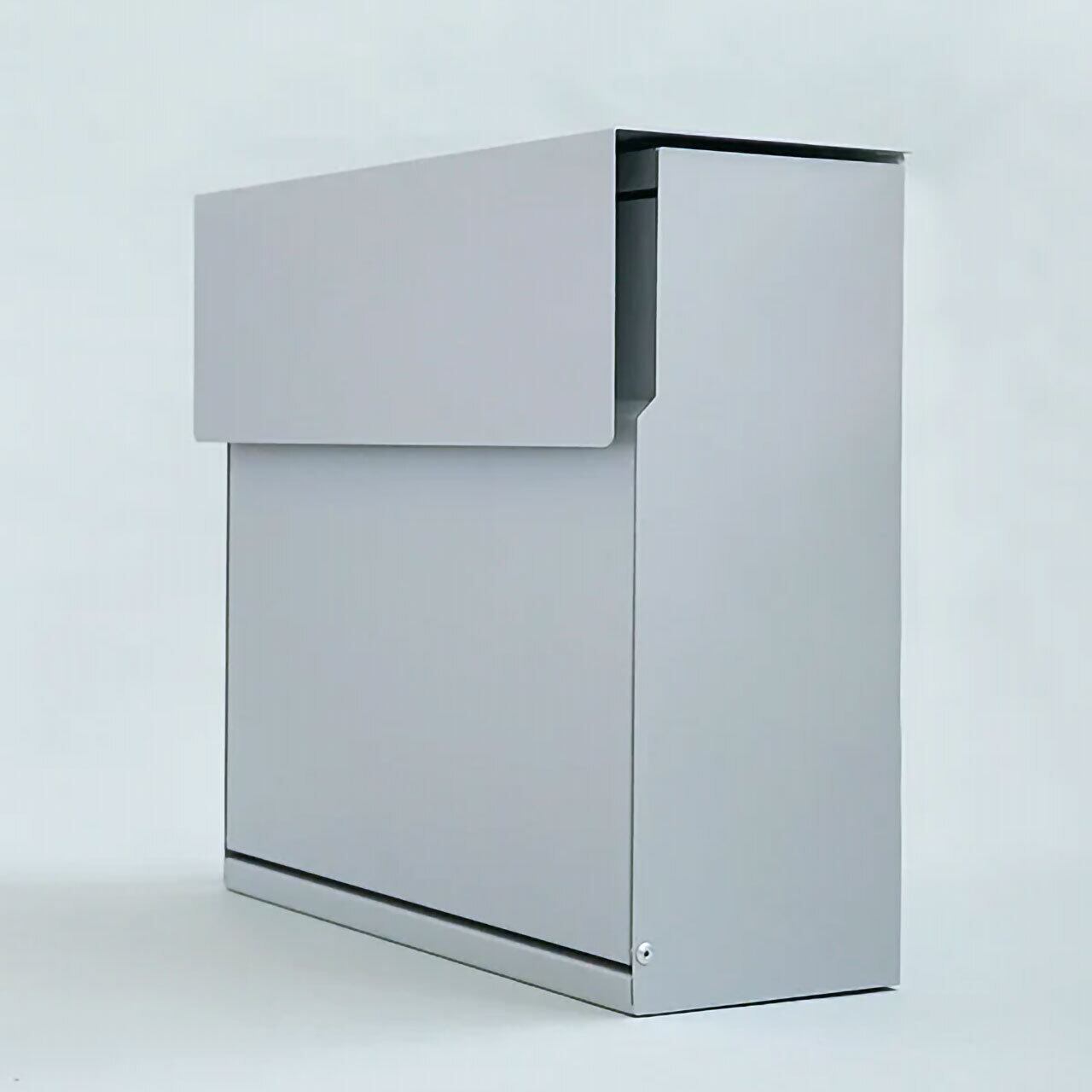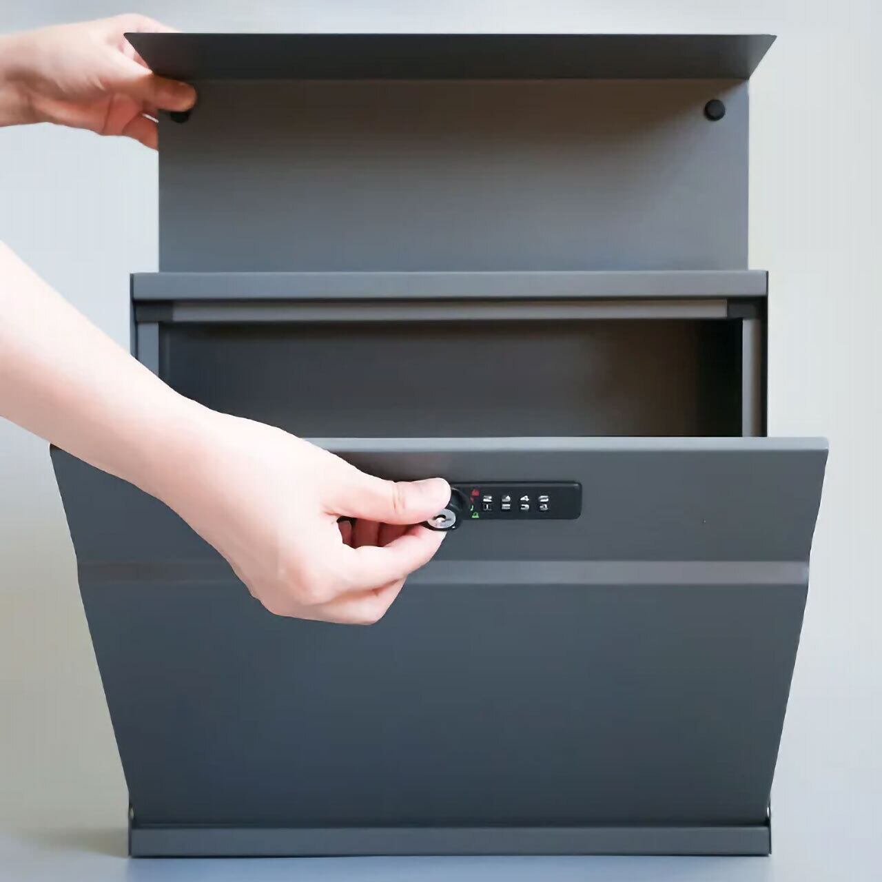 シンプルで直線的なデザインのポストです。キーや投函口が外からは見えないため、スッキリとした見た目をしています。フタ部分に手を掛けて持ち上げると投函口が現れます。ダイヤル式のキーは防犯性に優れており、街中の住宅にもぴったり。サイズは大きめでA4サイズの書類も投函可能。住宅・店舗・事務所などさまざまな場所でご使用いただけます。ソリッドな印象の外観の建物はもちろん、古民家の様な相反する印象の物件にもシンプルさが逆にアクセントに。