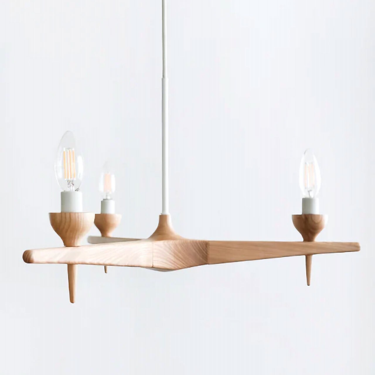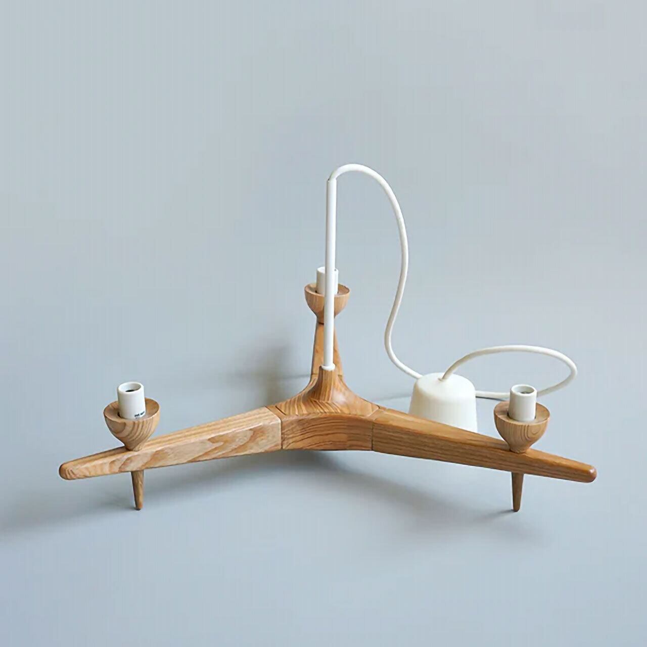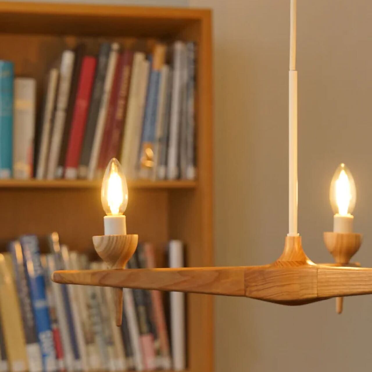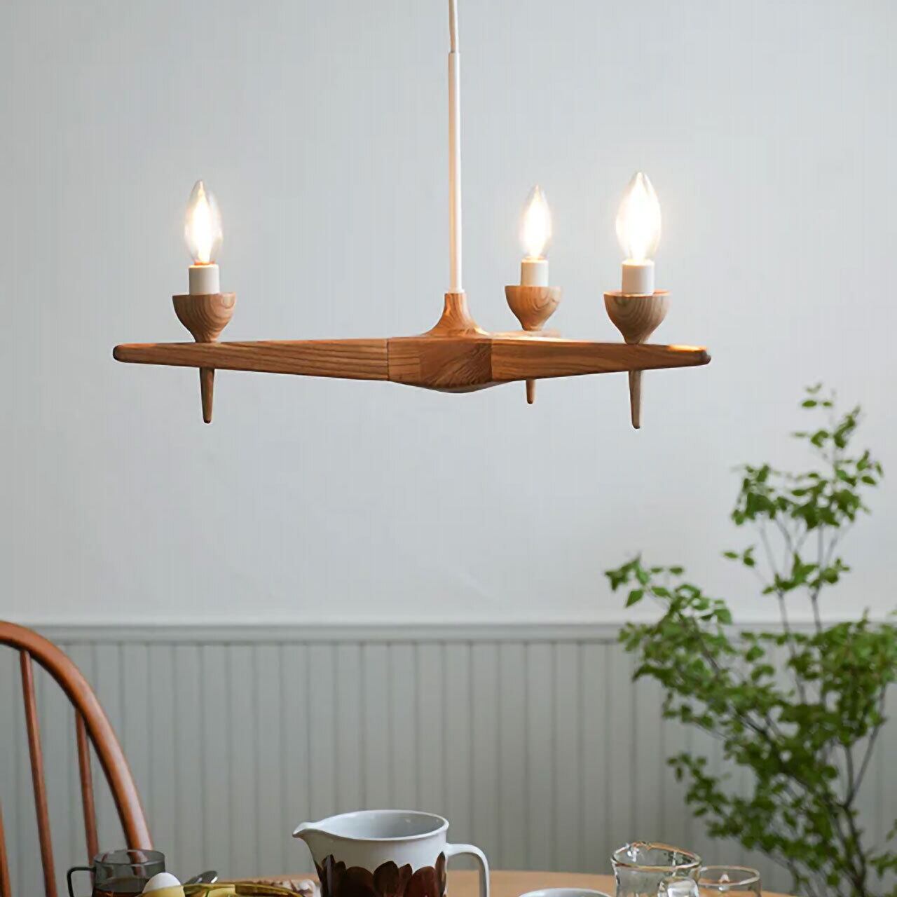 どこか懐かしさを感じさせるデザイン。インテリアのアクセントとなる木製3灯シャンデリアです。まるで手で削り出したような曲線的なフォルムと天然木の風合いを生かした素の色合いはシンプル・ナチュラルなインテリアに馴染みます。3灯タイプは小さすぎず大きすぎないサイズ感で、ダイニングの照明として使用するのはもちろん、リビングや個室など様々な空間でお使いいいただけます。コード長は約100cmと長めになっているので、天井が低い場所ではコードアジャスター等を使用して長さを調節してください。