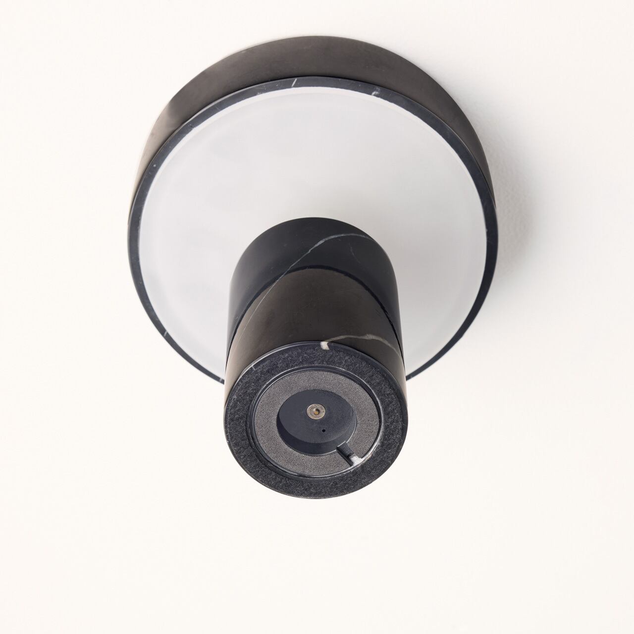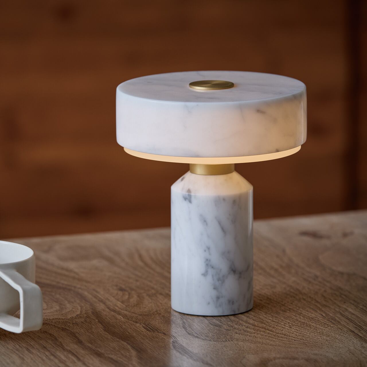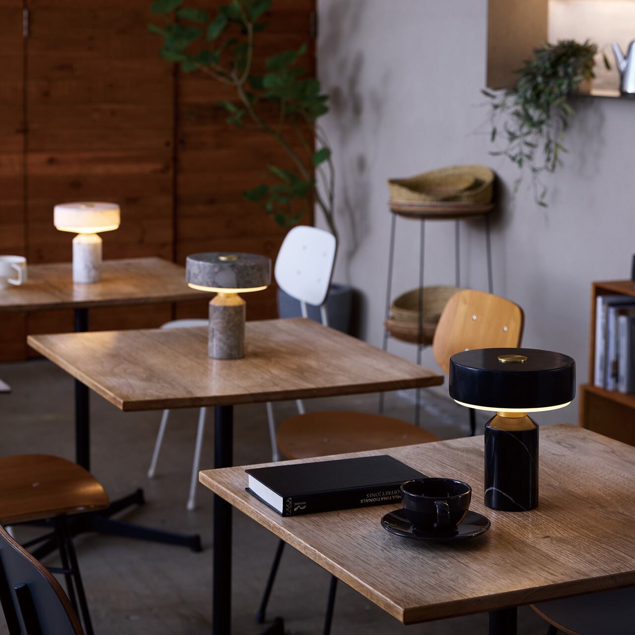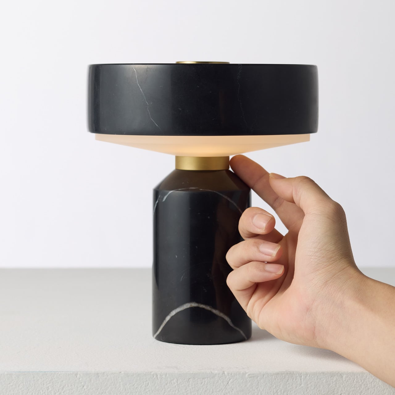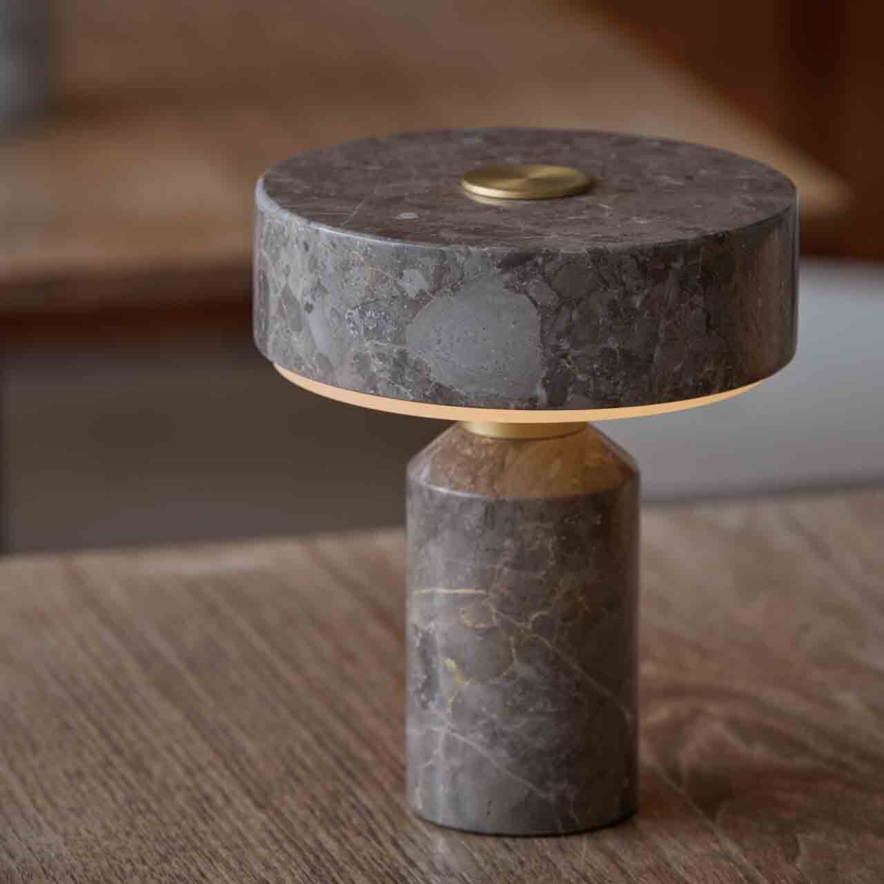 ホテルライクな雰囲気漂う天然大理石を使用した本体に対し、アクセントに真鍮パーツをあしらい、ゴールドのアクセントが一層の落ち着きと高級感あるプロダクトに仕上げています。ベースとシェード間の首部分にある真鍮パーツはタッチスイッチになっており、3段階の調光とOFFを繰り返します。また、USB充電式なので、コンセントの場所を気にすることなく好きな場所に設置、移動できます。品格ある上質な佇まい、穏やかな光はリビングや寝室をはじめ、カフェやバー、ホテルラウンジなど商業用途にも向いています。