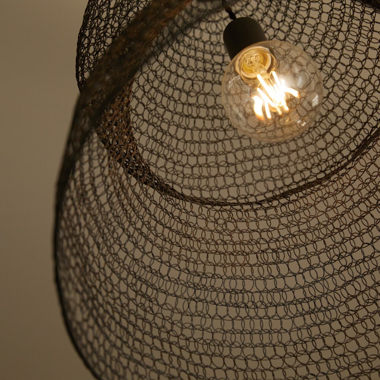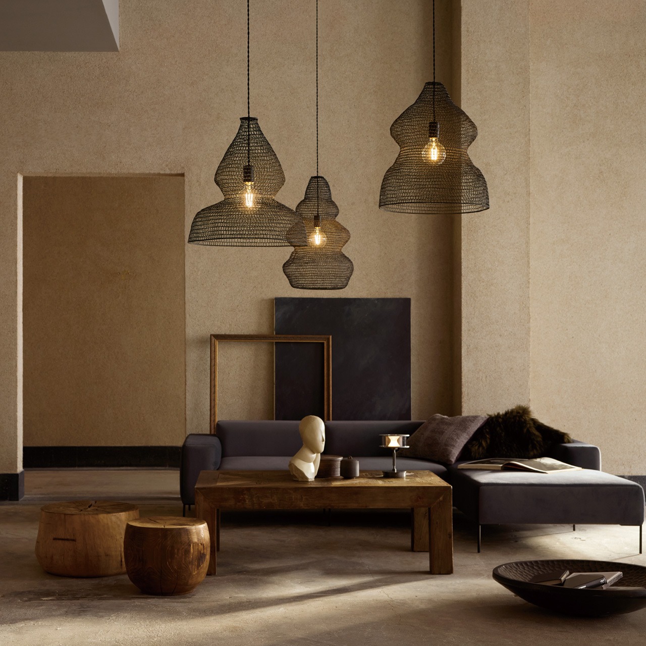 ブラック色でシックに仕上げたメッシュシェードは一つ一つハンドメイドで仕上げています。印象的なそのシルエットはアートピースのよう。メッシュを通して光る灯りはどこかノスタルジックな表情も見せます。ボリューム感のあるサイズですがメッシュであるがゆえに圧迫感はさほどなく、比較的限られた空間であるエントランスや階段、廊下での連続多灯吊りなどにもお使いいただけます。シェード形状は3パターンをご用意。同じ形状で揃えるもよし、異なる形状で変化をつけるもよし、それぞれに魅せる印象的なシルエットをお楽しみください。