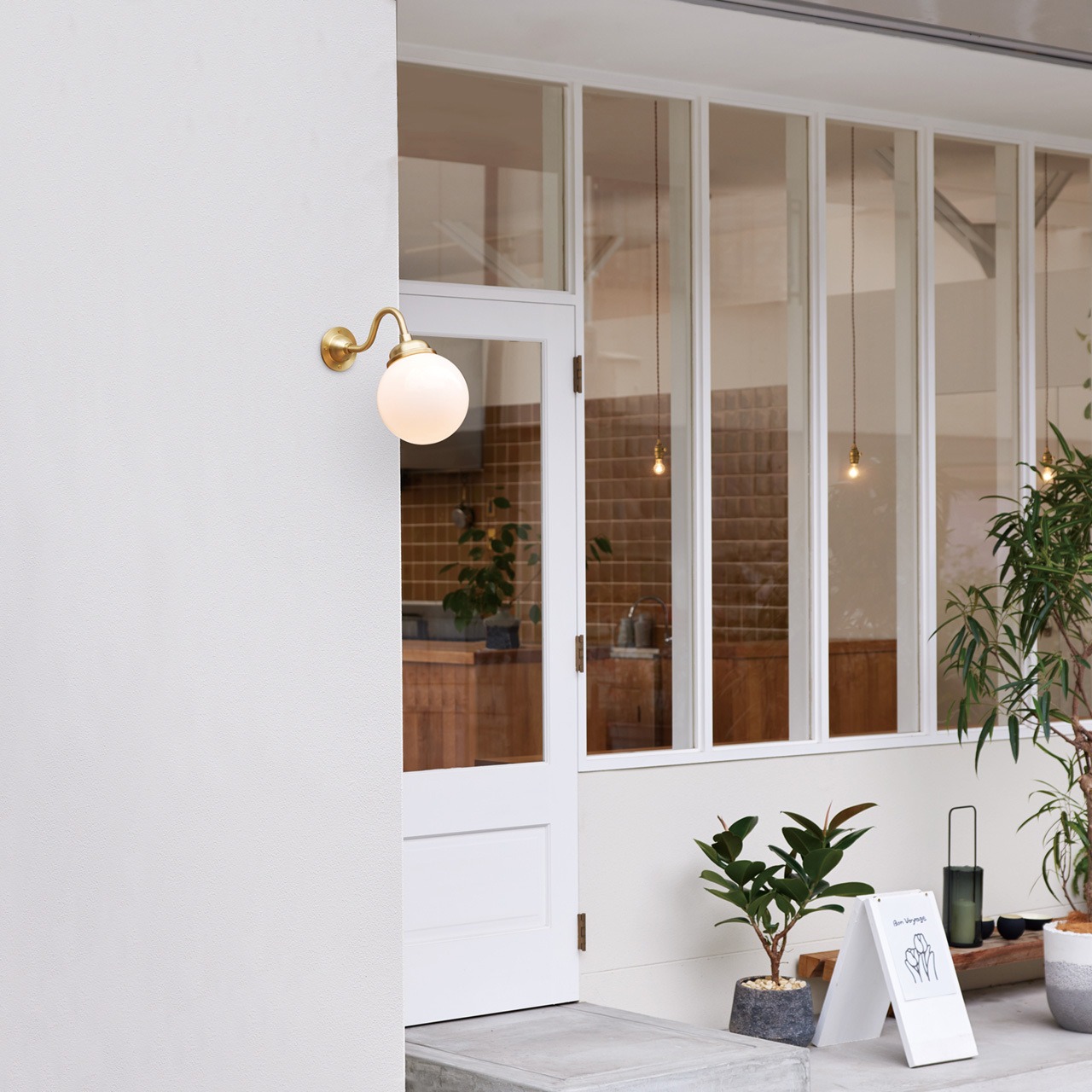 ガラスグローブを使用した人気シリーズ「Bliss」に屋外仕様が仲間入り。シェードデザインやサイジングはそのままに、自宅玄関の軒先や店舗エントランス、施設のファサードなどにも大変オススメな雰囲気あるアームタイプのウォールランプです。しっとりした乳白ガラスから灯る優しい光が特徴的ですが、アームやベースは意外なほど堅牢的な造りでドッシリと重厚感があり、末長くお使いいただけます。ベースのカラーはシックなブラックと素材の味わいが魅力なブラスの2色からお選びいただけます。