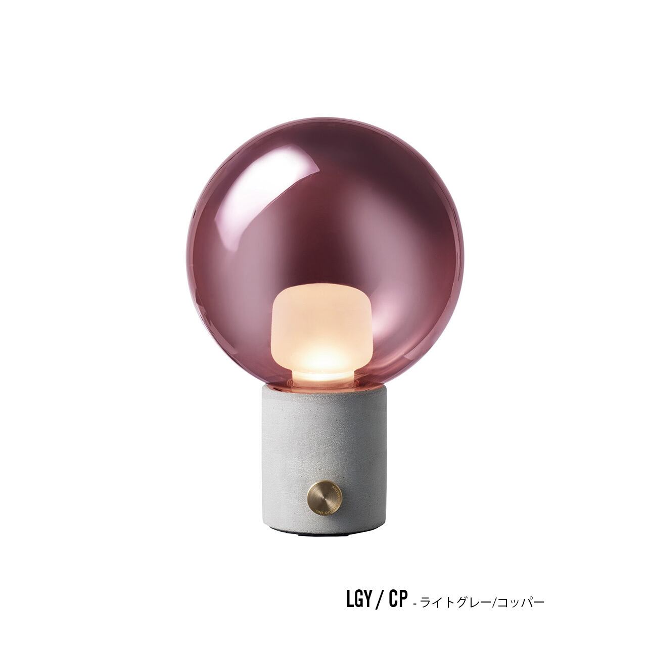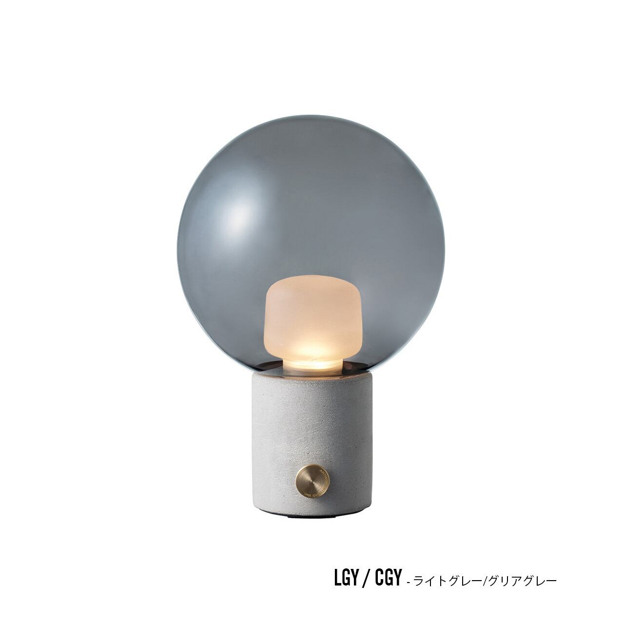 趣のあるコンクリートベースに球体のガラスシェードを組み合わせました。真鍮素材のボリュームツマミを回すとシェード内側に取り付けられた小さなインナーシェードを通して柔らかな光が溢れます。ベース色はシックなアッシュブラックとコンクリートの風合いを楽しめるライトグレーの2種類、それぞれシェードカラーには透明のグレーと、反射のあるクロームとコッパーの3種類を取り揃えました。