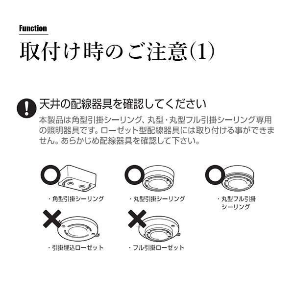 ■取付に関するご注意事項:※本品は角型引掛シーリング、丸型引掛シーリング、丸形フル引掛シーリング専用です。ローゼット型器具にはお取り付けいただけません。あらかじめ天井に備わっている器具の種別をご確認ください。