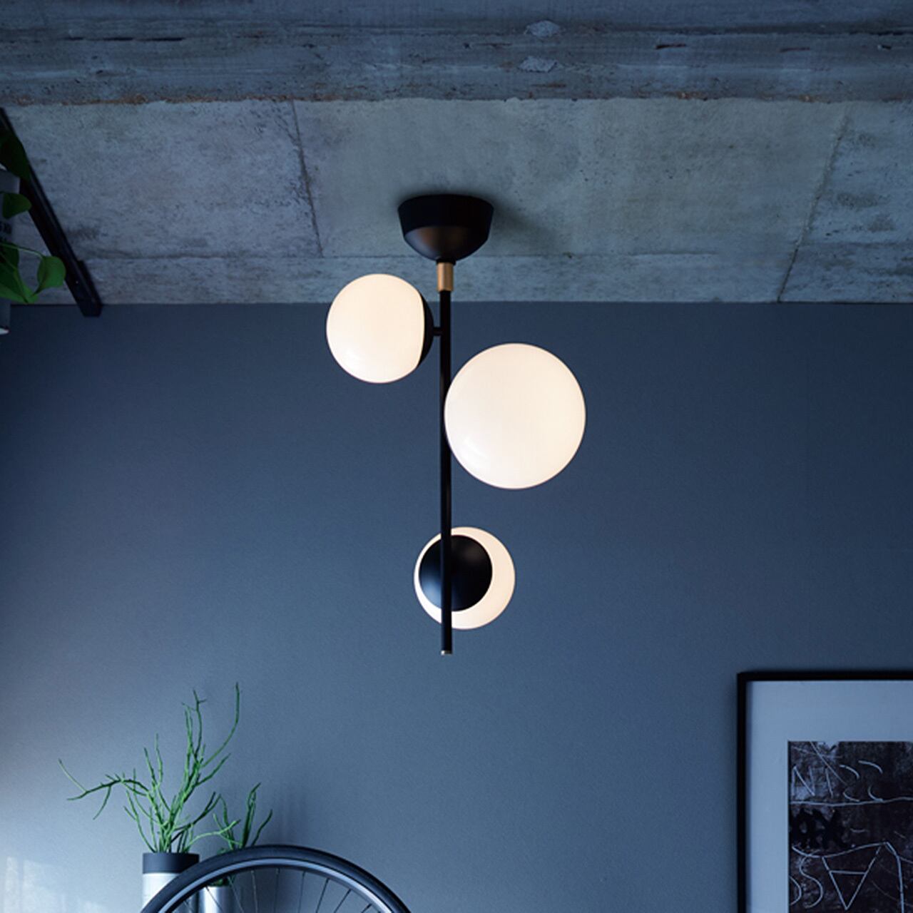 ガラスグローブを使用した多彩な人気シリーズ「Bliss」にニュータイプのシーリングライトが仲間入り。天井から垂直に伸びたバーに大小3個のBlissシェードをランダムに取り付けました。天井近くから横に広がるシーリングライトや下方向に吊り下げて照らすペンダントとは違った絶妙な高さ加減が特徴的で、リビングはもちろん、ダイニングでの使用や、吹き抜け空間のインテリア照明としてもおすすめです。透明感が美しいクリアシェードと柔らかで優しい光のホワイトシェードがございます。