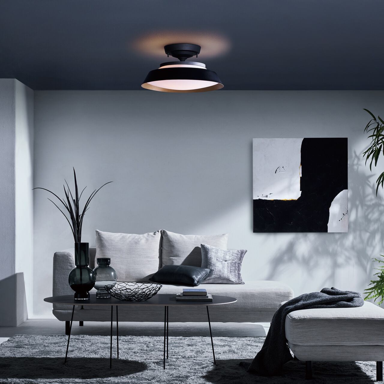 クラシカルなシーリング照明をアートワークスタジオスタイルでアップデートした「Graph-remote ceiling lamp」がLED内蔵タイプとなって再登場しました。シックな艶消しブラックとホワイトの本体には樹脂製のグローブを採用し扱い易さと軽量化を実現。LEDは天井側にも光が漏れる設計で、お部屋全体を優しく照らします。新たにリモコンもリデザインされ、従来の点灯状態を記憶できるメモリー機能に加えて7段階+無段階での調光調色も可能な上、常夜灯も追加装備され使い易さも大幅に充実。「Graph」の特徴でもあるシェードを追加することで自分好みの雰囲気にブラッシュアップできるオプションもご用意。内側を落ち着きあるゴールドカラーに仕上げたスチール製シェードと、木目の美しいプライウッド製シェードからお選びください。