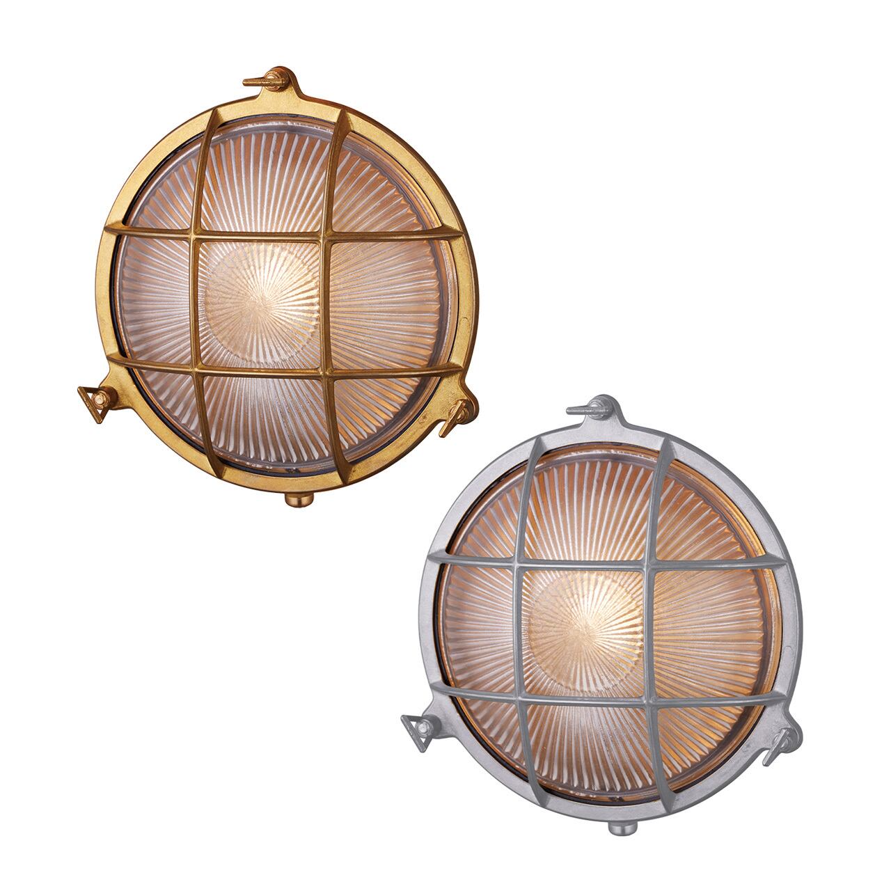 船舶用照明として実際に用いられている耐久性・防水性の高い本物のパーツを使ってデザイン〜製品化した「Beach house」シリーズ。ズッシリとした真鍮製のガードや、BODY本体の重厚感・堅牢さが醸し出すレトロ感とマリン仕様独特の雰囲気はインテリアとしての存在感も抜群、真鍮ならではのエイジングも楽しみのひとつです。お部屋のインテリア照明やカフェやショップ、ホテルなどの施設照明としてはもちろん、防雨仕様ですので街灯や門灯・外壁等のエクステリア照明としても大変おすすめ。シリーズを通じてブラス色、シルバー色の2カラーからお選びいただけます。※イメージ画像はサイズ違いのBR-5025になります。