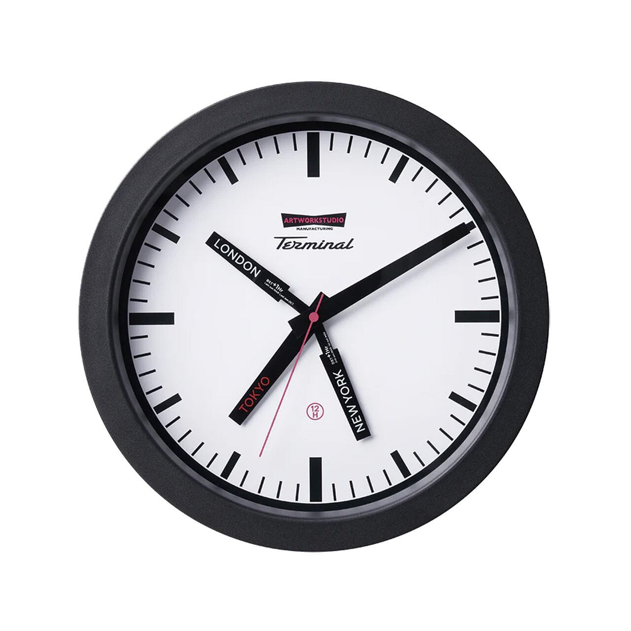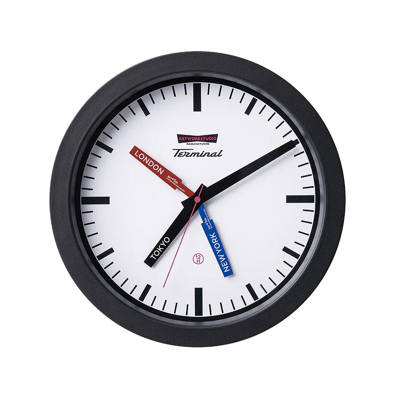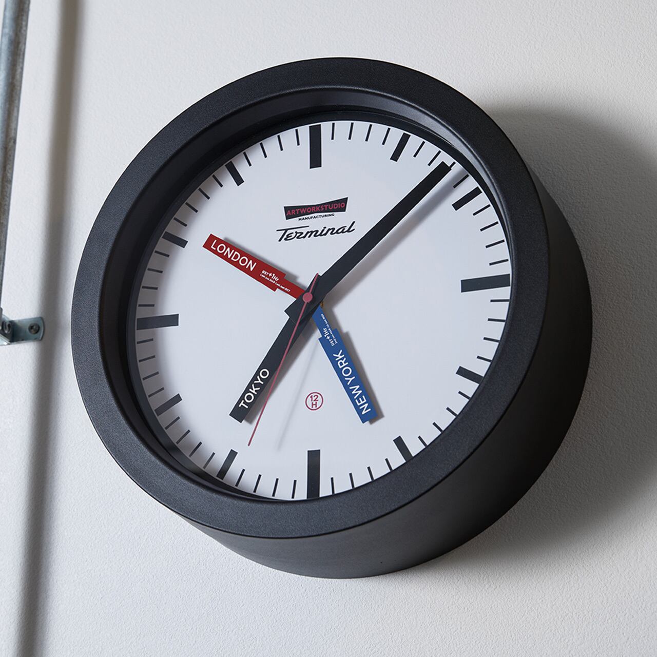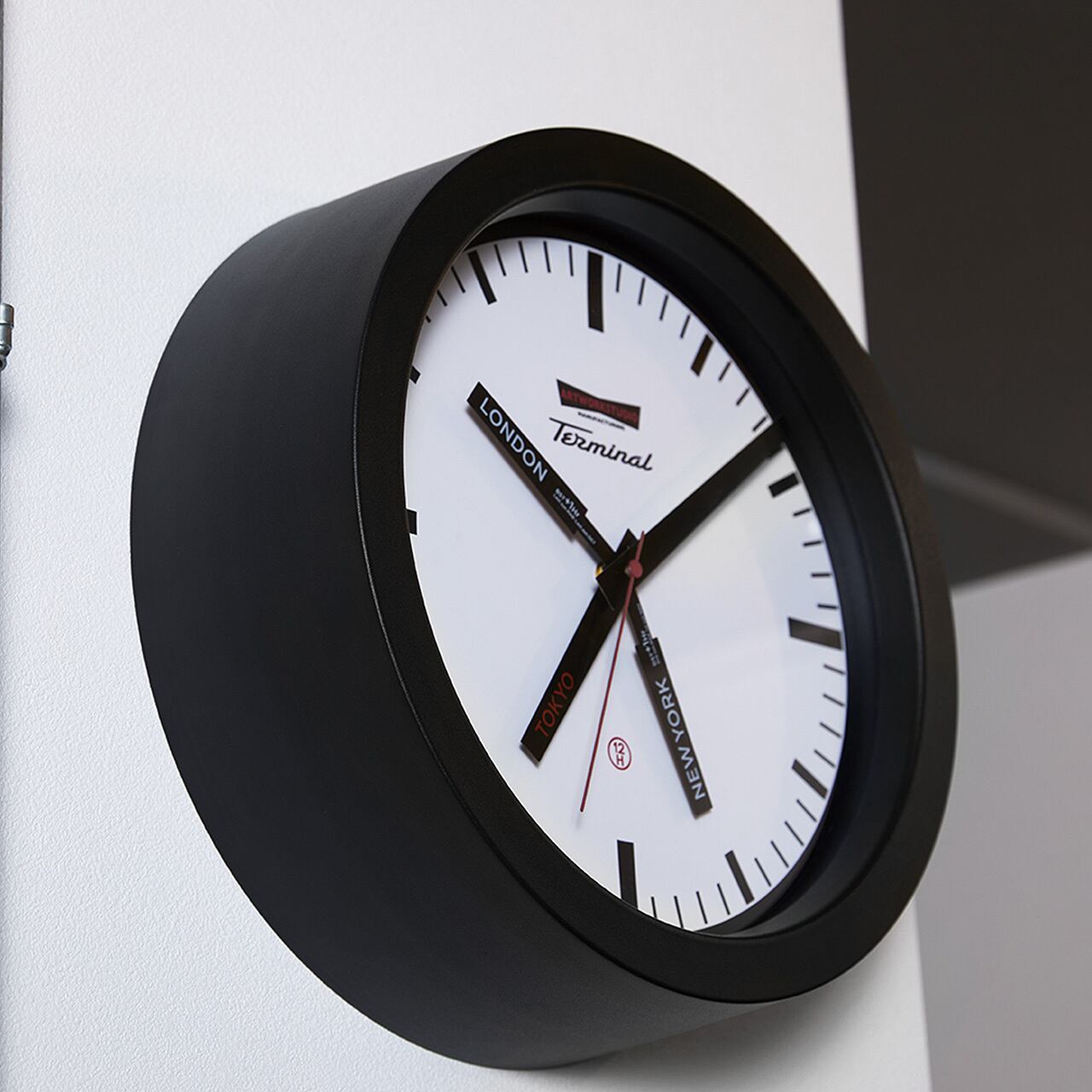 ホワイトの文字盤にスッキリしたインデックスで海外の駅舎をイメージしたベーシックなデザインのウォールクロック「Terminal-wall clock」。通常1本の短針を2本追加し、GMT表示機能(TOKYO/NEWYORK/LONDONの3都市時刻)を備えた斬新なスタイルの壁掛け時計が完成しました。深めの奥行きとエッジを効かせたフレームも印象的です。ブラックとミックスの2パターンの針の配色からお選びください。