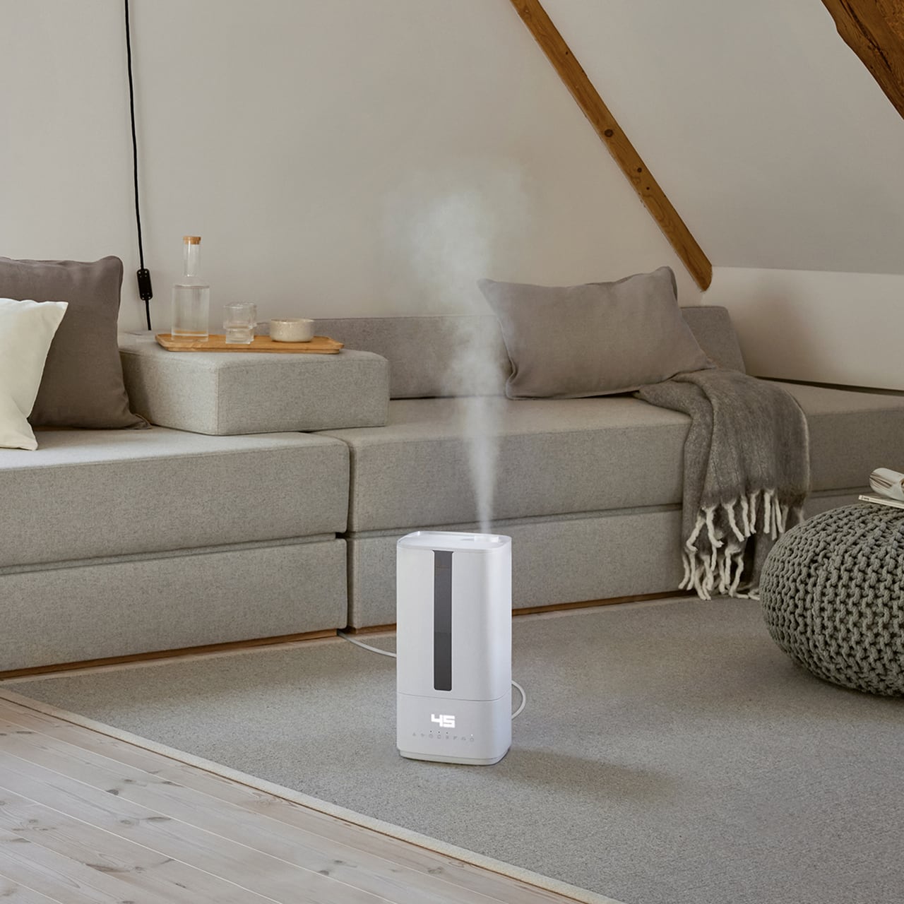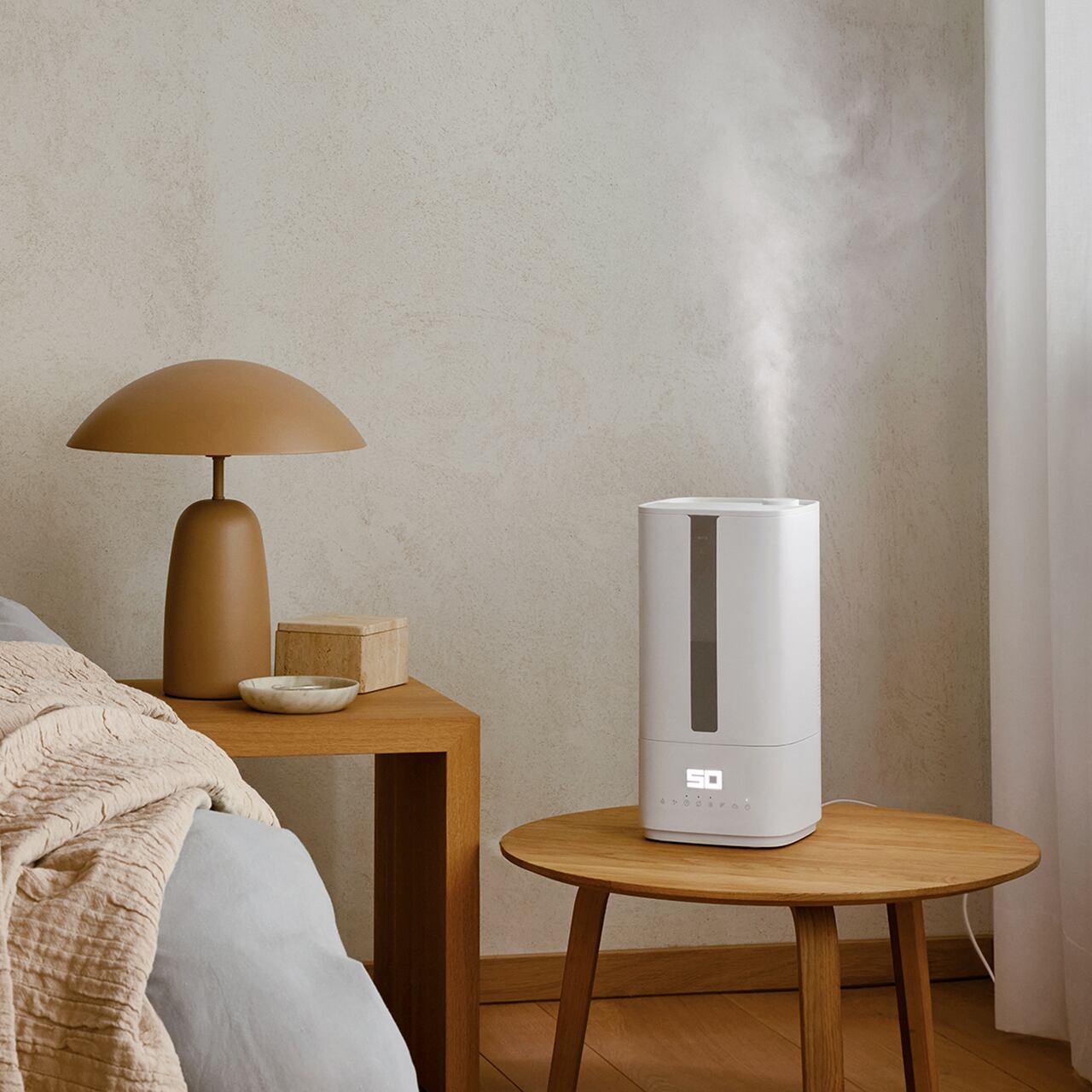 霧化前の水は内蔵の UV ランプによって照射され、99.99% の細菌を除去。衛生的で安心してお使いいただけます。給水はとても簡単。運転中でも上部のフタを開けて水を注ぐだけで完了します。さらに、内蔵の芳香容器にお好みのエッセンシャルオイルを数滴垂らせば、加湿とともにほのかな香りが広がる癒しの空間を演出できます。湿度は 30% から 75% まで自由に設定可能。自動モードではセンサーが室内の湿度を感知し、出力を自動調整。常に一定で心地よい湿度環境を維持します。内蔵されたUVライト技術は、超音波振動板によって水が細かいミストに変換される前に、機器内の水を消毒します。これにより、細菌やその他の有害微生物が減少し、衛生的な加湿が保証されます。健康上の理由から、UVライトはアクセスできない場所に安全に設置されており、自動的に作動し、メンテナンスは必要ありません。