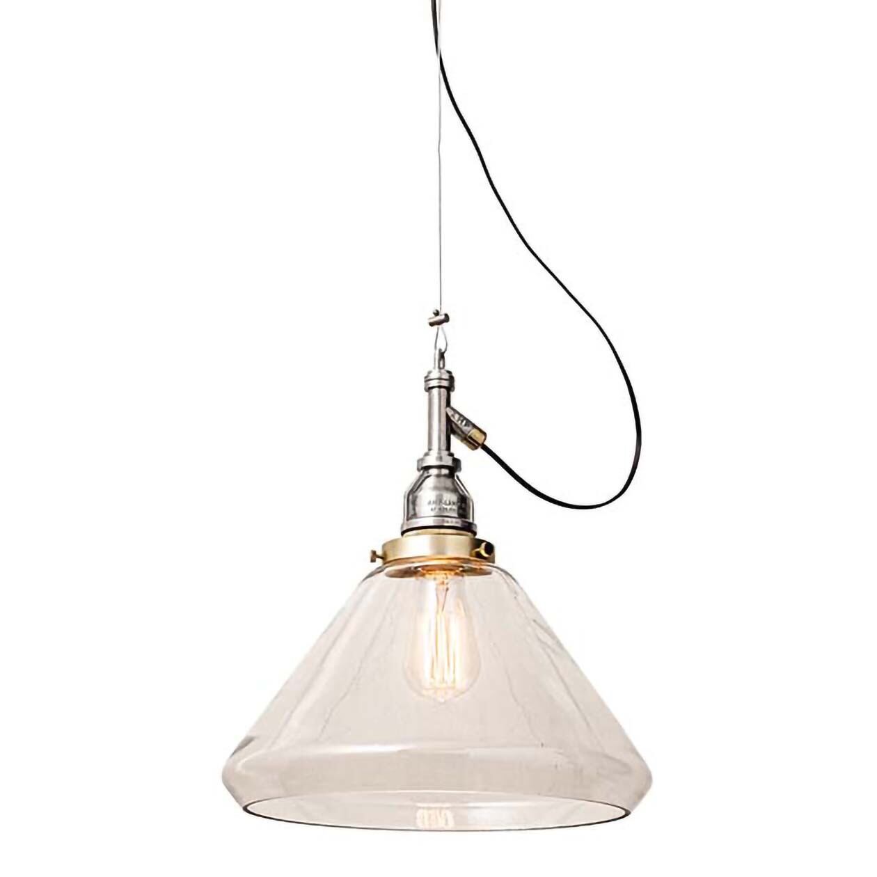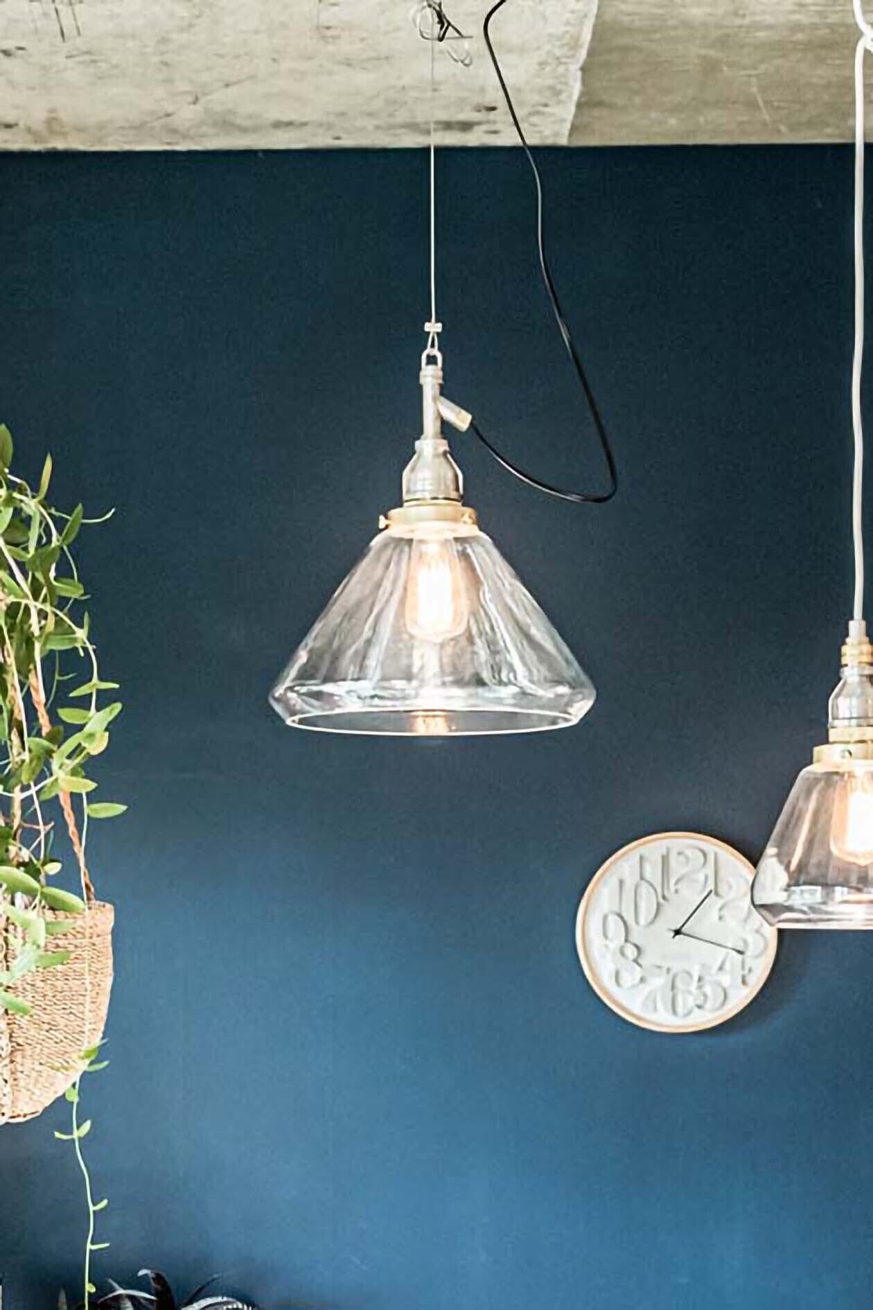 存在感あるソケットは点灯時だけでなく、消灯時にもその輝きを放っています。やや大振りながらも圧迫感を感じないクリアガラスとの相性抜群。※電球は付属していません。