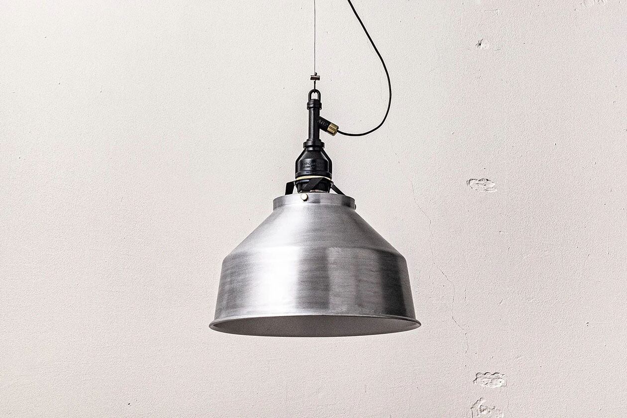 ヨーロッパの工場などで広く使用されていたインダストリアルランプに インスピレーションを受け生まれたアルミセード シリーズ。 セードはアルミの素材を生かしラフに仕上げたアルミのヘアライン仕上げです。ブラック色はマットに仕上げ、アルミダイキャスト製でシルバーに鈍く光るソケットとのコントラストが一層のインダストリアル感を演出しています。少し小振りなスモールサイズは様々なシーンで活用でき、武骨なエッセンスを追加することができます。多灯吊りでショップのような雰囲気にも。