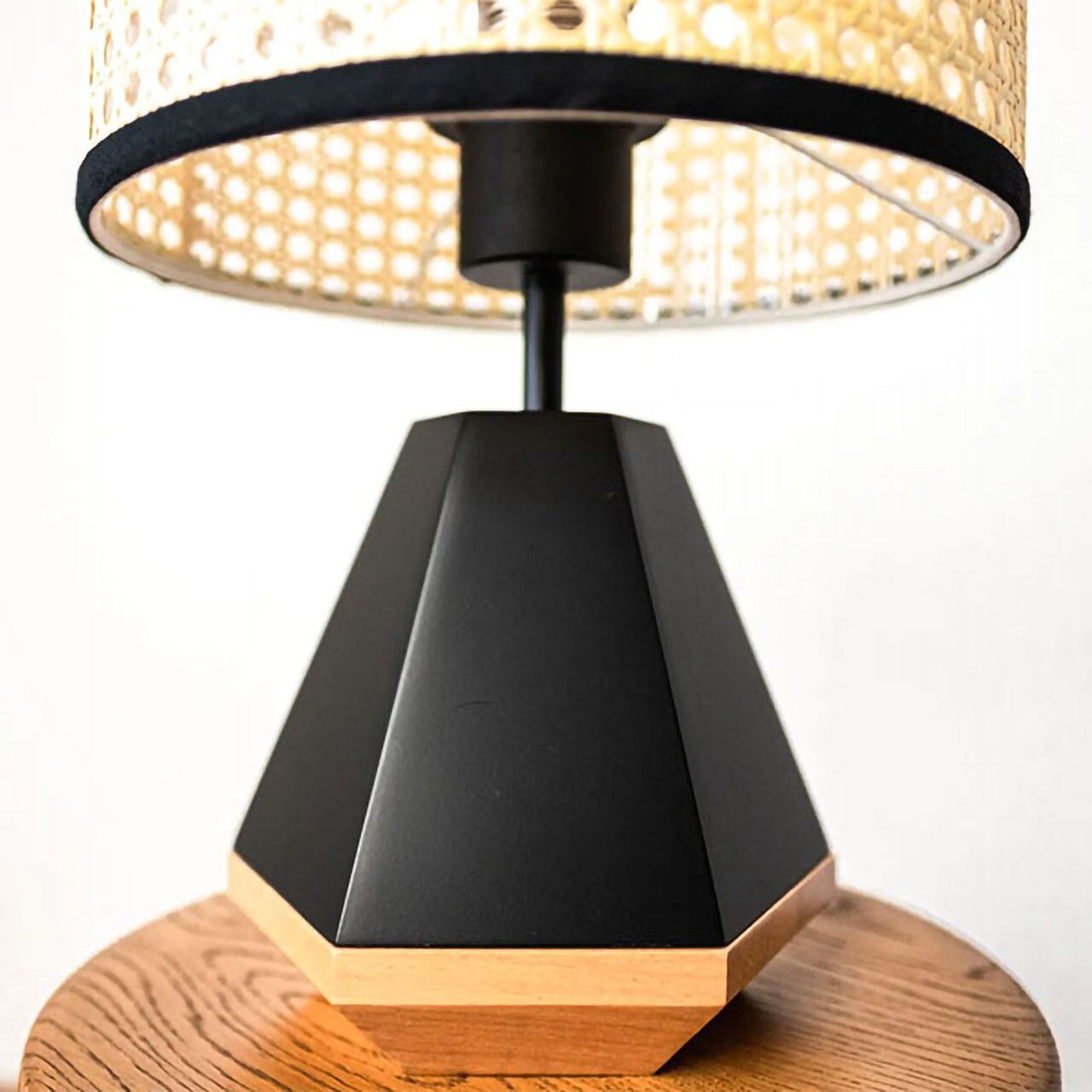特徴的なセードのマテリアル はピエール・ジャンヌレの家具などでよく 見られるラタンを編んだ技法を現代の素材で再現したもの。幾何学的な 形状のベースと相まってナチュラルになり過ぎないデザインになっています。編み込んだ隙間から漏れる光が壁面などを照らし幻想的な空間が広がります。