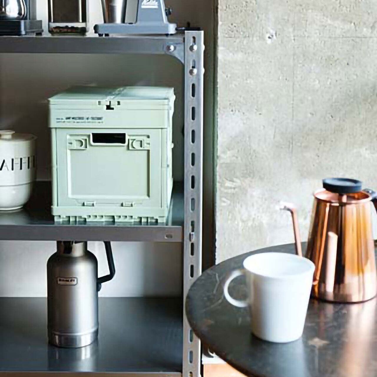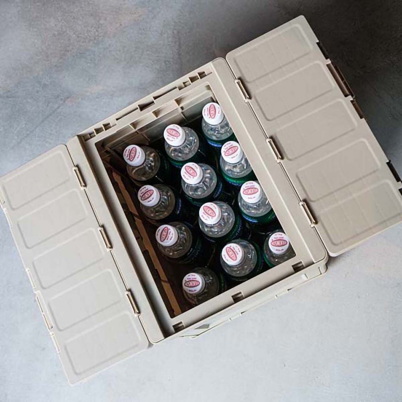 アウトドア、ミリタリー調の武骨で堅牢なデザイン。折り畳みコンテナと思いきやテーブルにもなり、テーブル使用時もコンテナ内に収納したものを出し入れできる構造にもなっているマルチコンテナ。もちろん通常のコンテナとしても活躍し、側面が開口するので重ね置き時にでも中のものが取り出せます。収納時には天板内部に脚を収納できるようになっており、最小限に折り畳み重ねて収納可能。天板部分、側面扉部分はロック機構が付いておりしっかりと閉まります。室内外を問わず多用途な収納用品としてご利用いただけます。容量は約16.5Lで500mlのペットボトルを立てて12本収納できます。