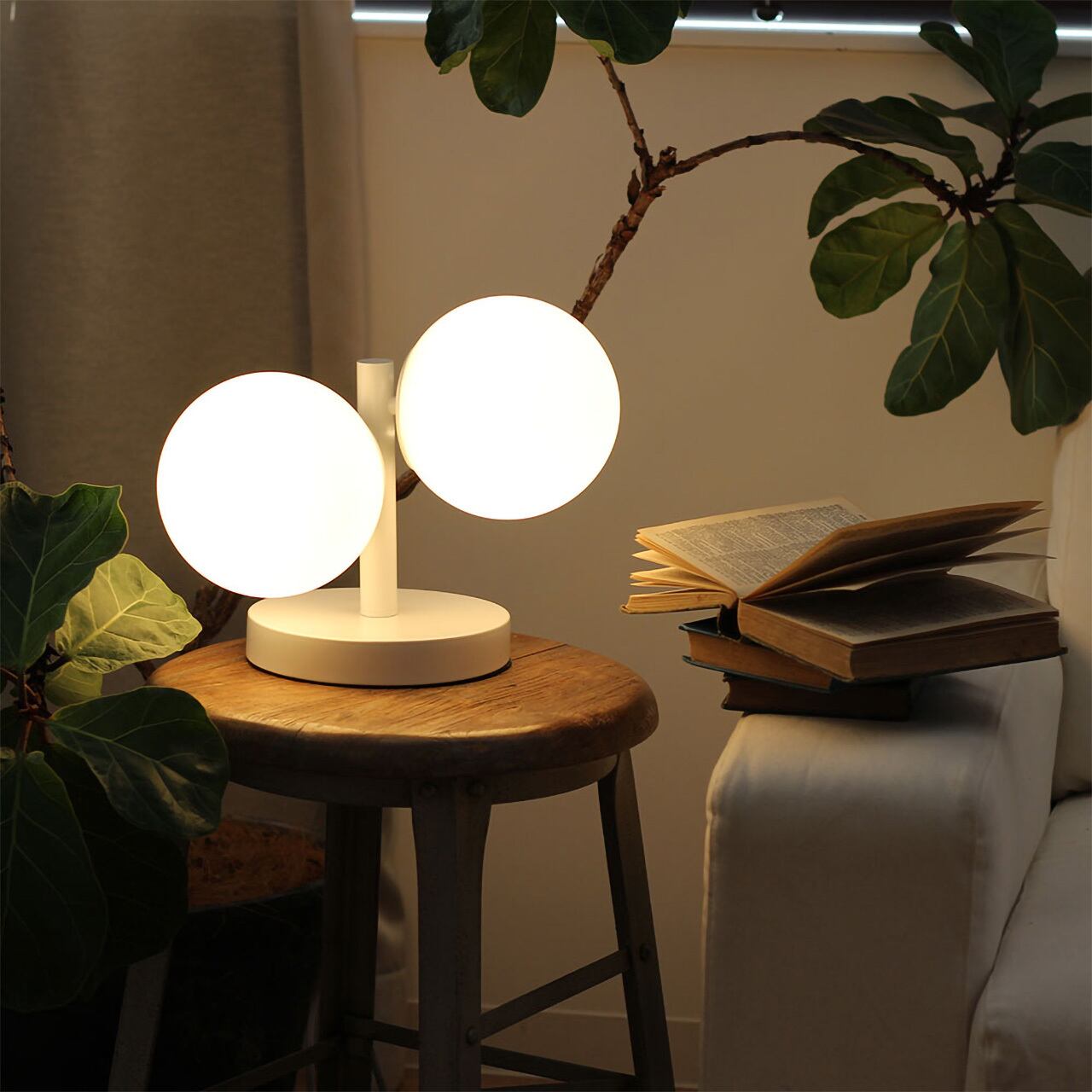穏やかで柔らかな雰囲気を醸し出すミルクガラスを2つ非対称に組み合わせ、愛らしさの中にも落ち着いた空間を演出してくれるテーブルライト。ベース部分にタッチスイッチを備え操作性にも配慮。キャビネットやデスクなどにスマートに配置ができ、様々な場所、インテリアにマッチする汎用性で使い勝手も抜群です。シーリングライトもラインナップしており、トータルコーディネートもおすすめ。