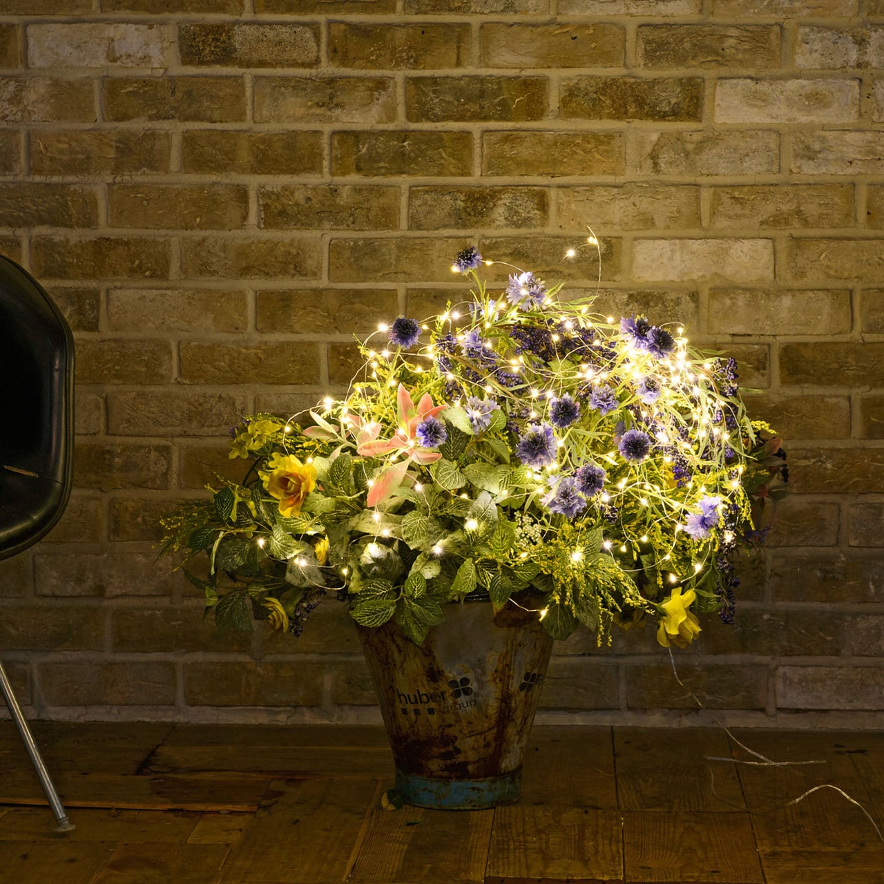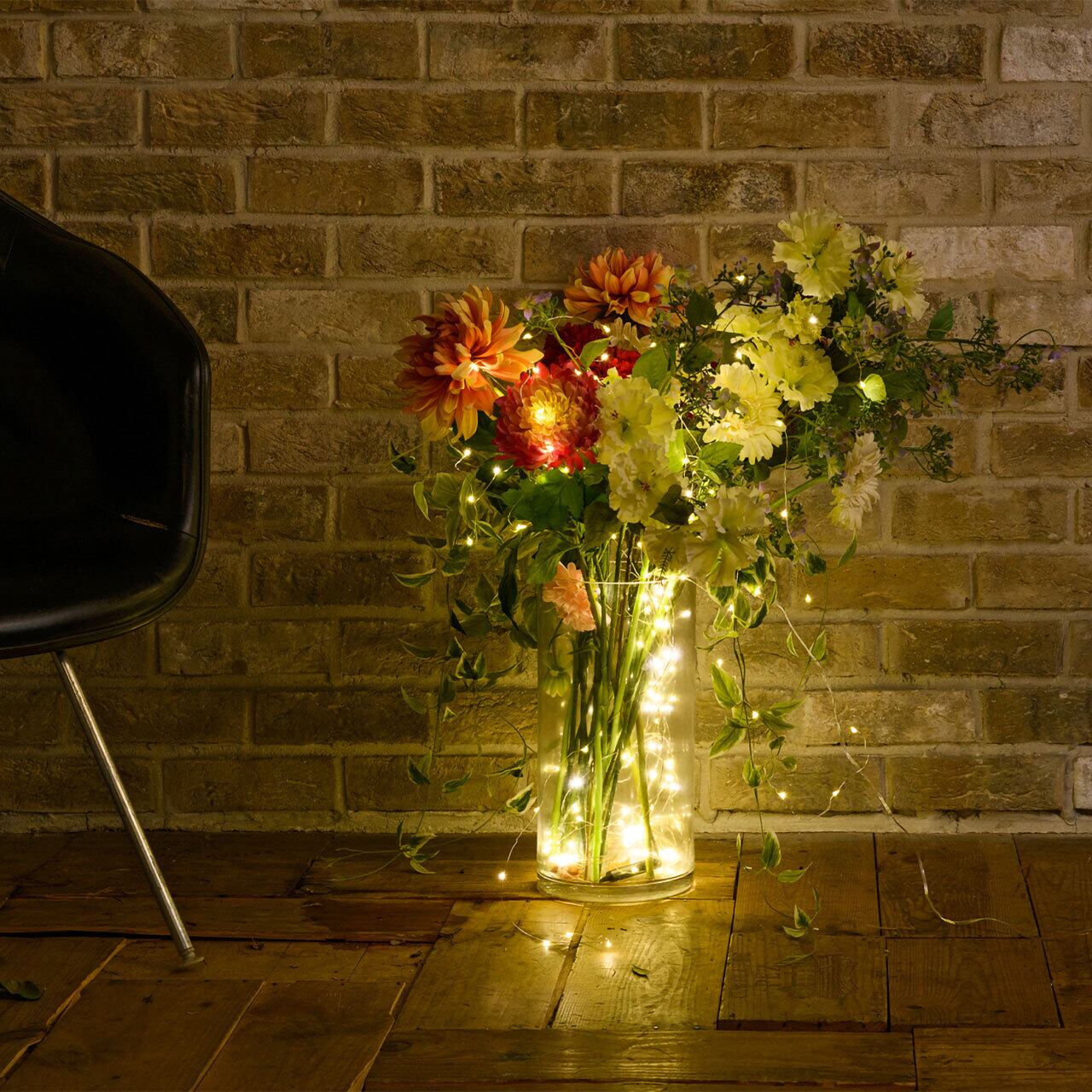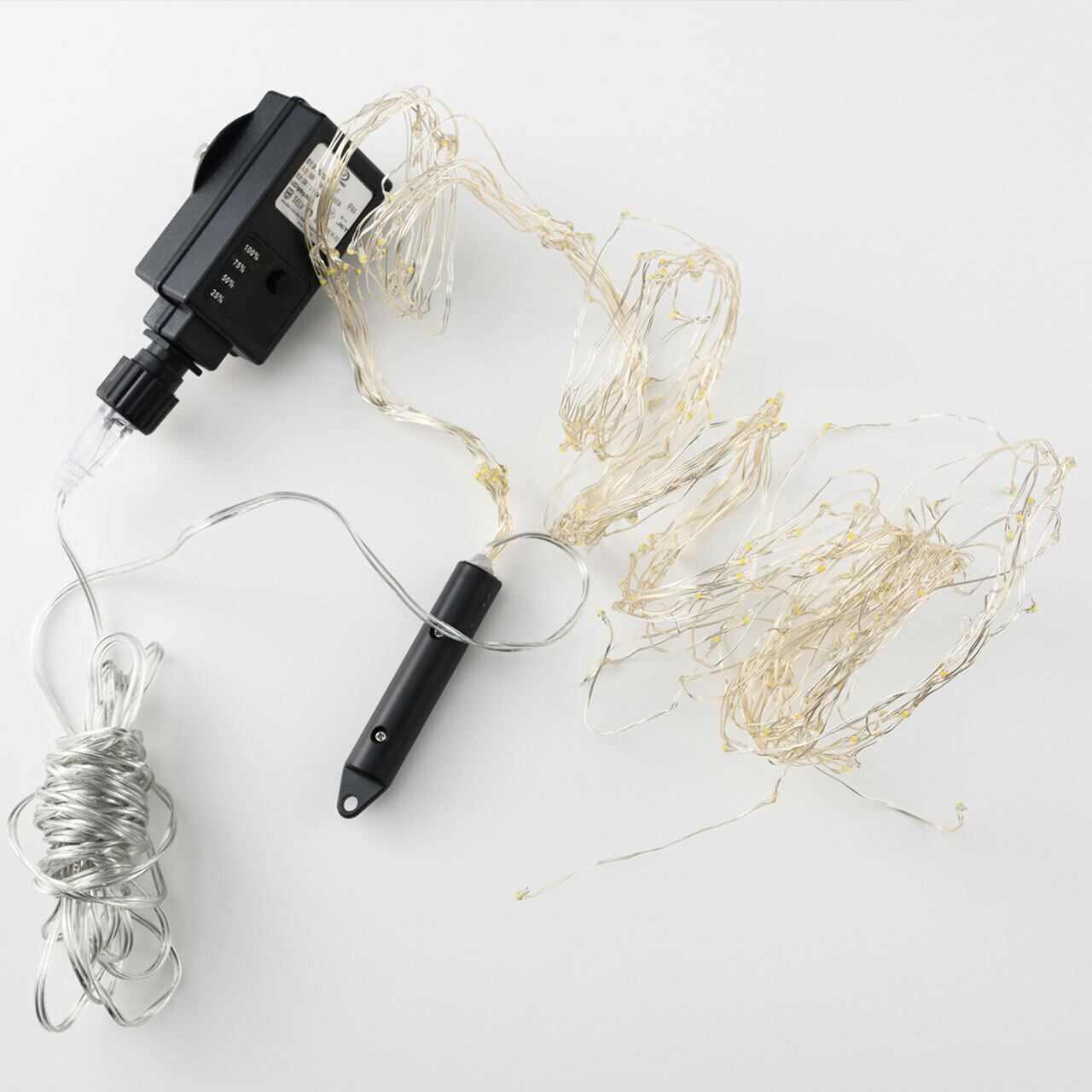防滴仕様のACアダプターを備えたコンセントタイプのガーランドライト。長さ2mでガラスの瓶や植物などにアレンジすると幻想的なイルミネーションに変化します。