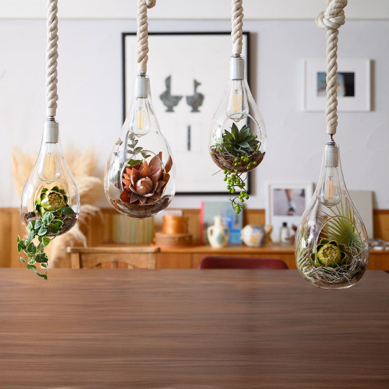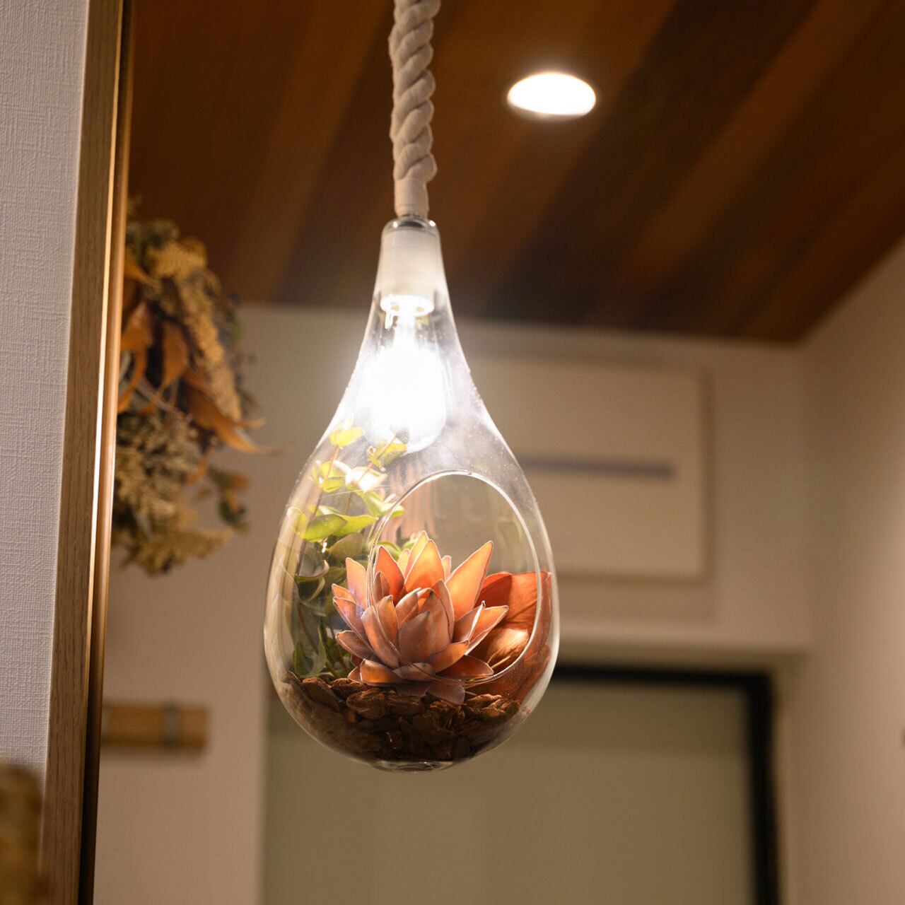 しずく型のシェードの中にフェイクグリーンを飾ってお楽しみいただけるペンダントライト。フェイクグリーンなので飾る場所も飾り方も自由自在。雑貨を飾るイメージで気軽にナチュラル&ボタニカルな要素をお部屋に取り入れることができます。フェイクグリーンにはリアルさにこだわったフェイクグリーンのセレクトショップ「いなざうるす屋」さんとのコラボにより、トレンドを意識した個性豊かなフェイクグリーンをラインナップ。ナチュラルでオーガニックな雰囲気を一層高めるロープ状コードは結ぶことで長さの調整とデザインにアクセントをつける事も可能です。サイズの異なるL、Mの2種をラインナップ。サイズを違えて複数吊りもオススメ。