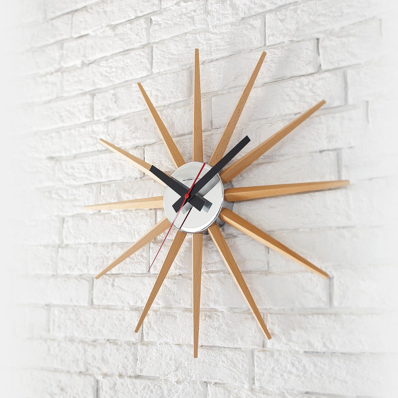 中央から延びたウッドが太陽のような壁掛け時計。存在感があり、空間の雰囲気を大胆に変えます。シンプルなお部屋のアクセントとしても最適。やさしくあたたかみのあるウッド素材は、北欧テイストのお部屋にぴったりです。ムーブメント:スイーブムーブメント