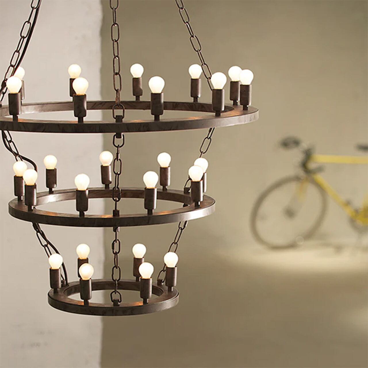 アンティーク感と現代的エッセンスの融合をコンセプトにシンプルながら圧倒的な存在感を放つ「Elements」シリーズ。多数の光が直接天井や壁面を照らすことでその反射光が空間全体を柔らかな輝きで包みます。どんなスペースにも合わせやすい9灯タイプの「Elements9」から、パブリックスペースや広い空間にも映える27灯タイプの「Elements27」まで4つのバリエーションで展開しています。たくさんの電球がキラキラと輝き、シャンデリアのように華やかな空間を演出してくれます。インパクトのある見た目とは裏腹に、小ぶりの電球がついた愛嬌のある雰囲気。お部屋のアクセントにオススメです。最大消費電力 675W (25W × 27)/スイッチ なし (壁面スイッチON/OFF)/高さ調節 730 〜 1,460 mm