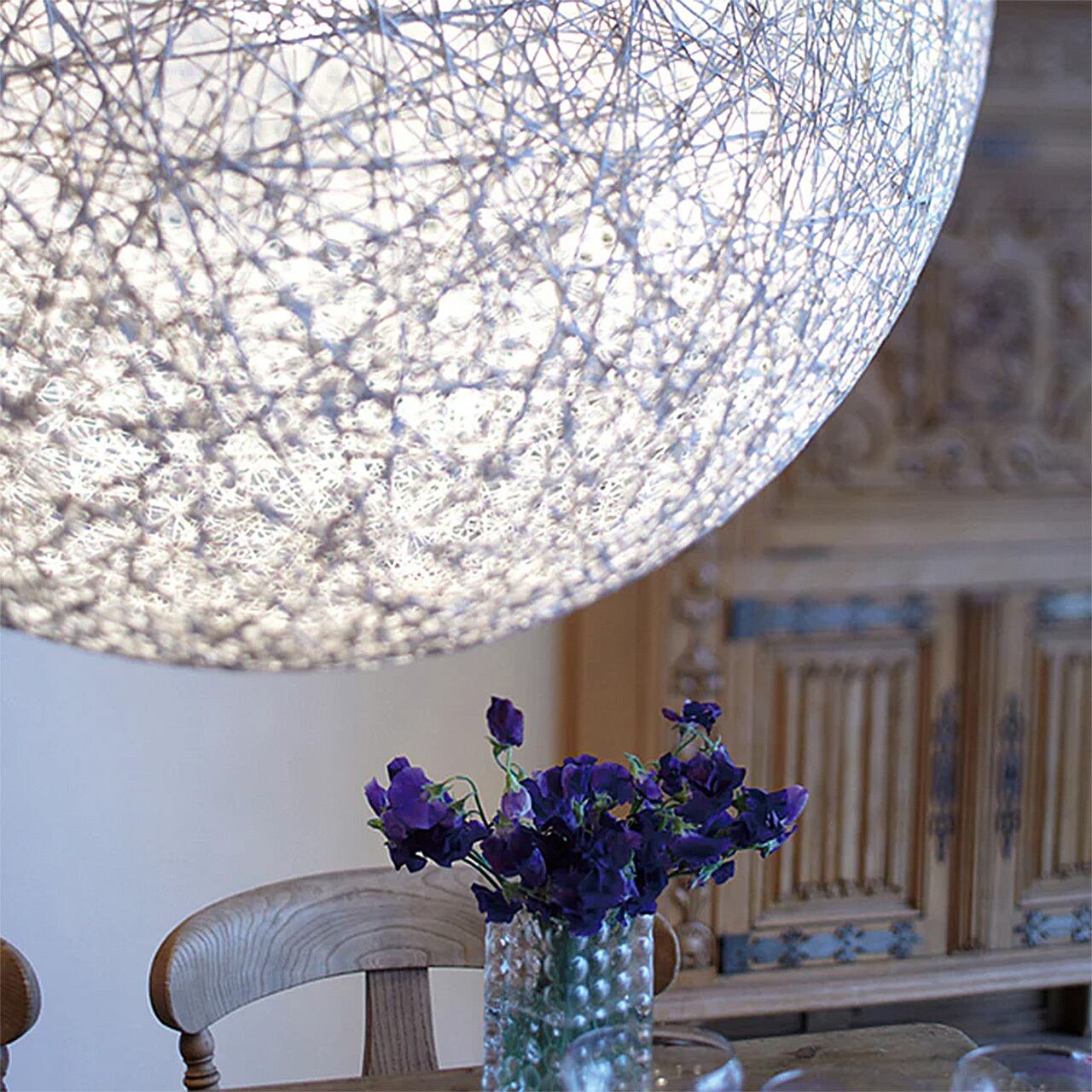 麻紐を樹脂でコーティングし、月のように丸いシェイプに仕上げ、凛とした存在感とあたたかみを演出しました。モダンな空間はもちろんアジアンテイストや和の空間にもよく合うデザインです。ランプを点灯させると周りの壁面に光の陰影が浮かび上がり幻想的な空間に。