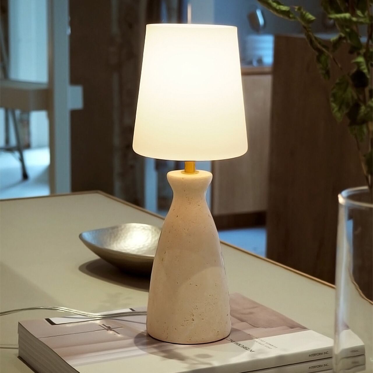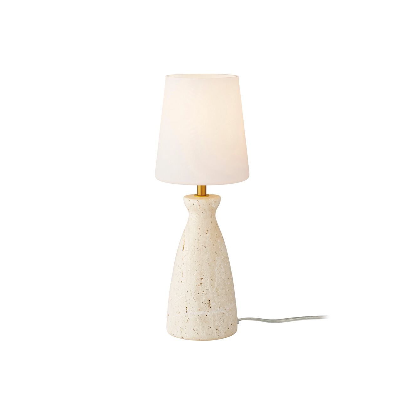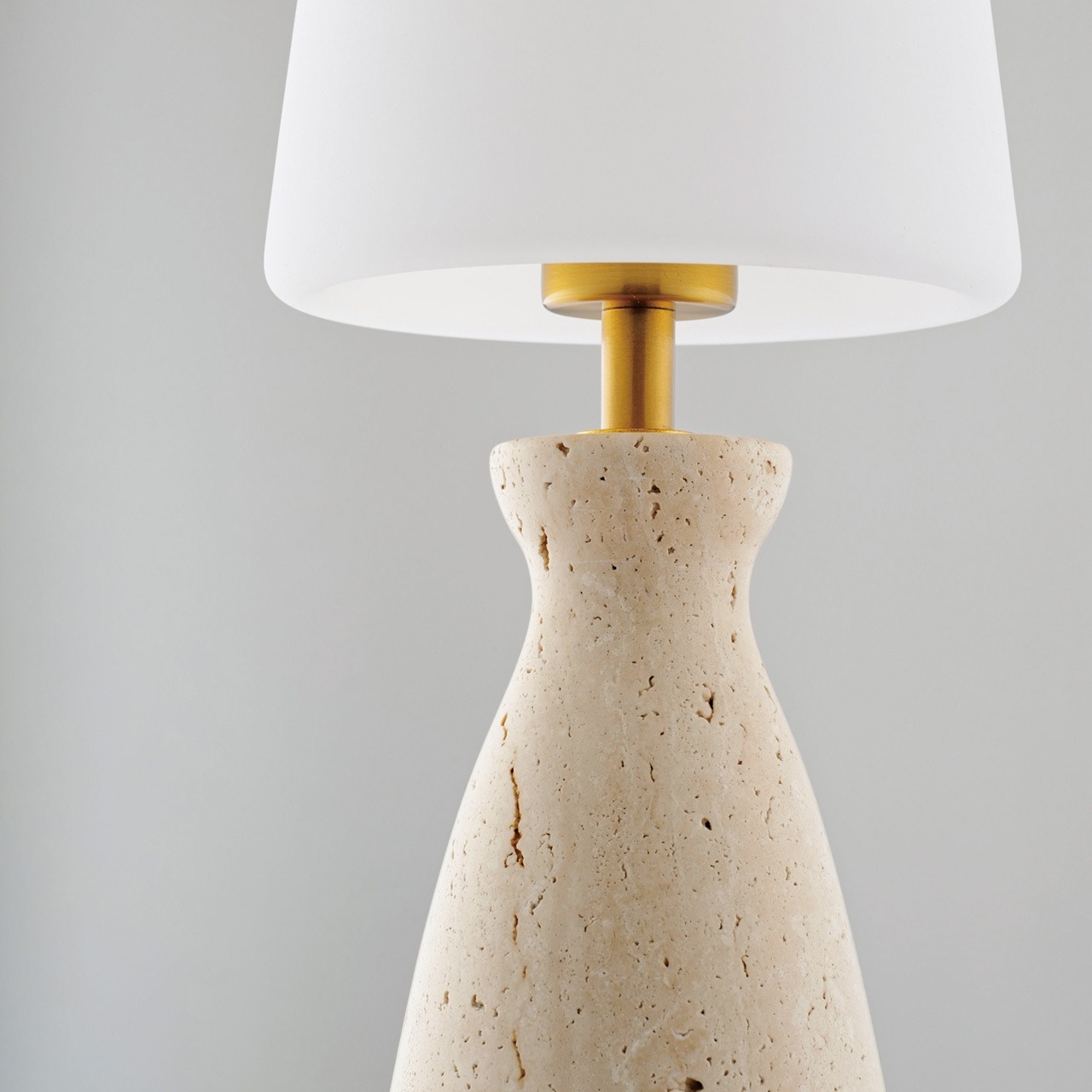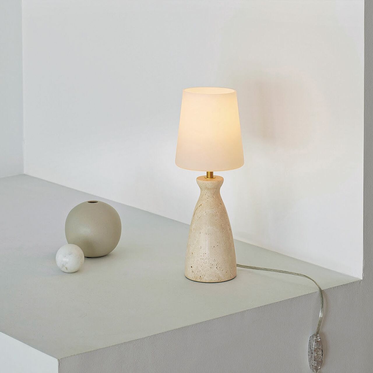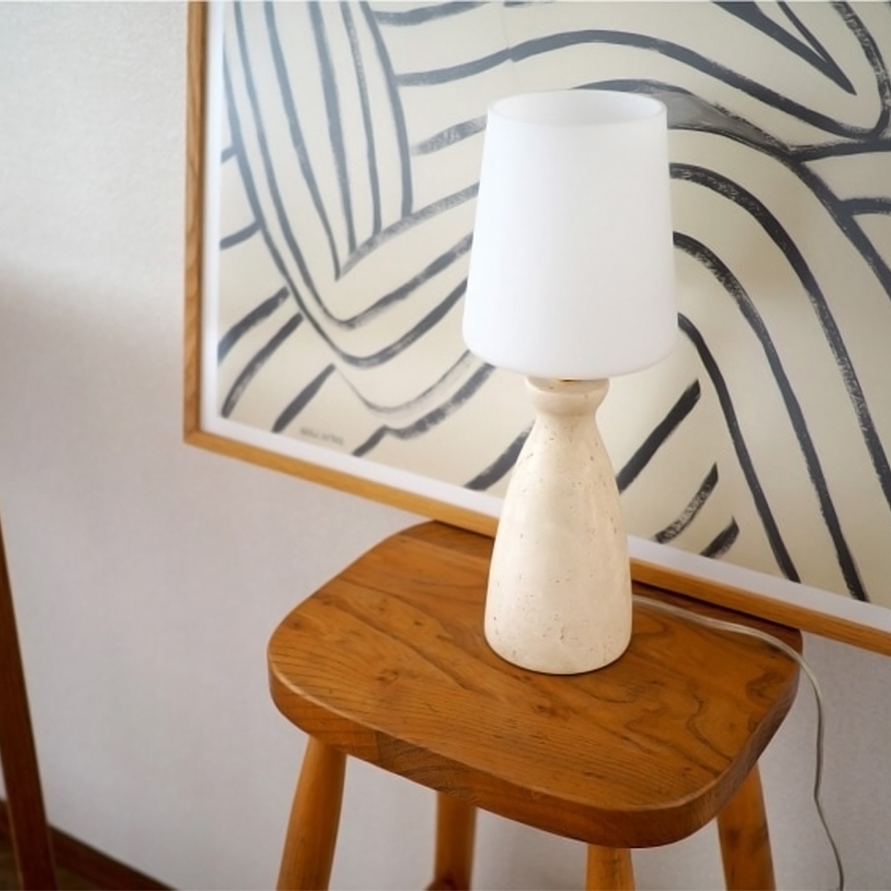 教会に灯る蝋燭のような洗練されたシルエットとぬくもりを兼ね備えた、佇まいそのものが美しい照明です。自然の造形が息づくトラバーチンを贅沢に削り出してつくる優美なくびれが、素材感を一層引き立てます。フロストガラスから伝わる光が、プリミティブな大理石やわずかに見えるゴールドのディテールを照らし出します。重厚感がありながらスリムなアウトラインで使い勝手も抜群。
