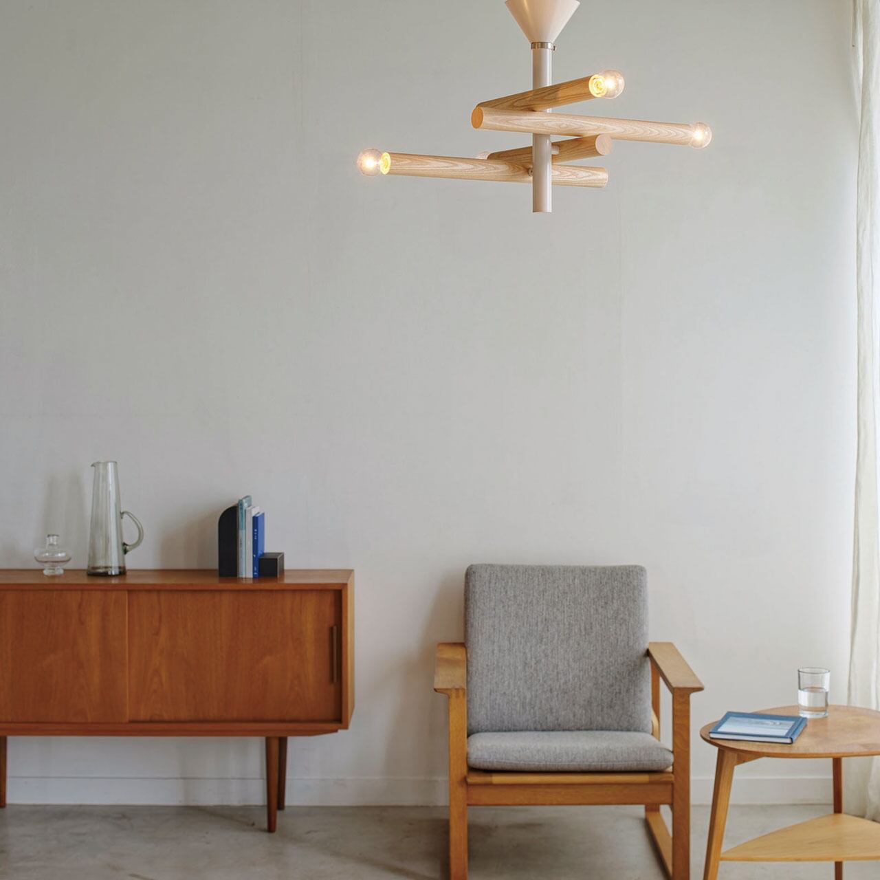 交差しあう直線が作る豊かな奥行きと確かな存在感。立体的に配置された木柱が木組み建築を想起させるアーキテクチュアルなデザイン。一見不規則ながらも計算し尽くされたプロポーションは角度によって、そのシルエットを大きく変化させます。あたたかみを感じさせる木を贅沢に使用し、空間との調和を図りました。