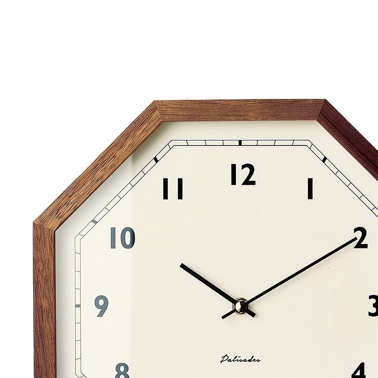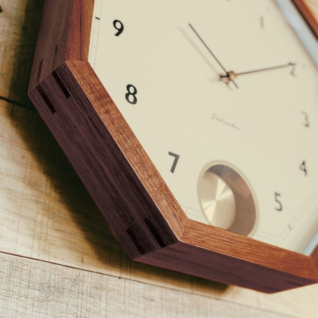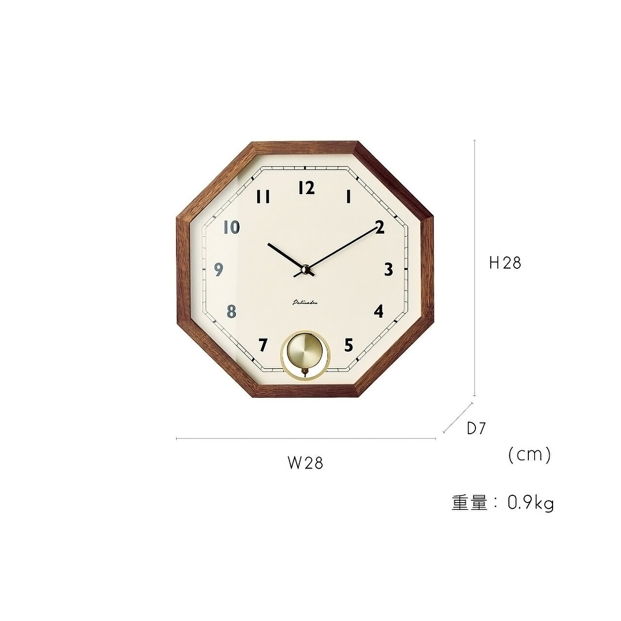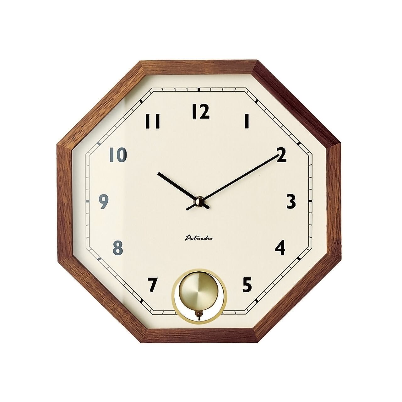 風水でも幸せを呼ぶとして人気の八角形でナチュラルベーシックな振り子時計。6の場所で左右に揺れるゴールド色の振り子がアクセントとなったレトロなデザインです。木のぬくもりとトラディショナルなインデックス、シンプルな中にも趣きあるパーツ類相まって、空間をあたたかく、穏やかに演出してくれます。