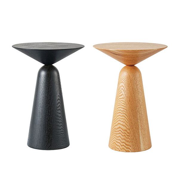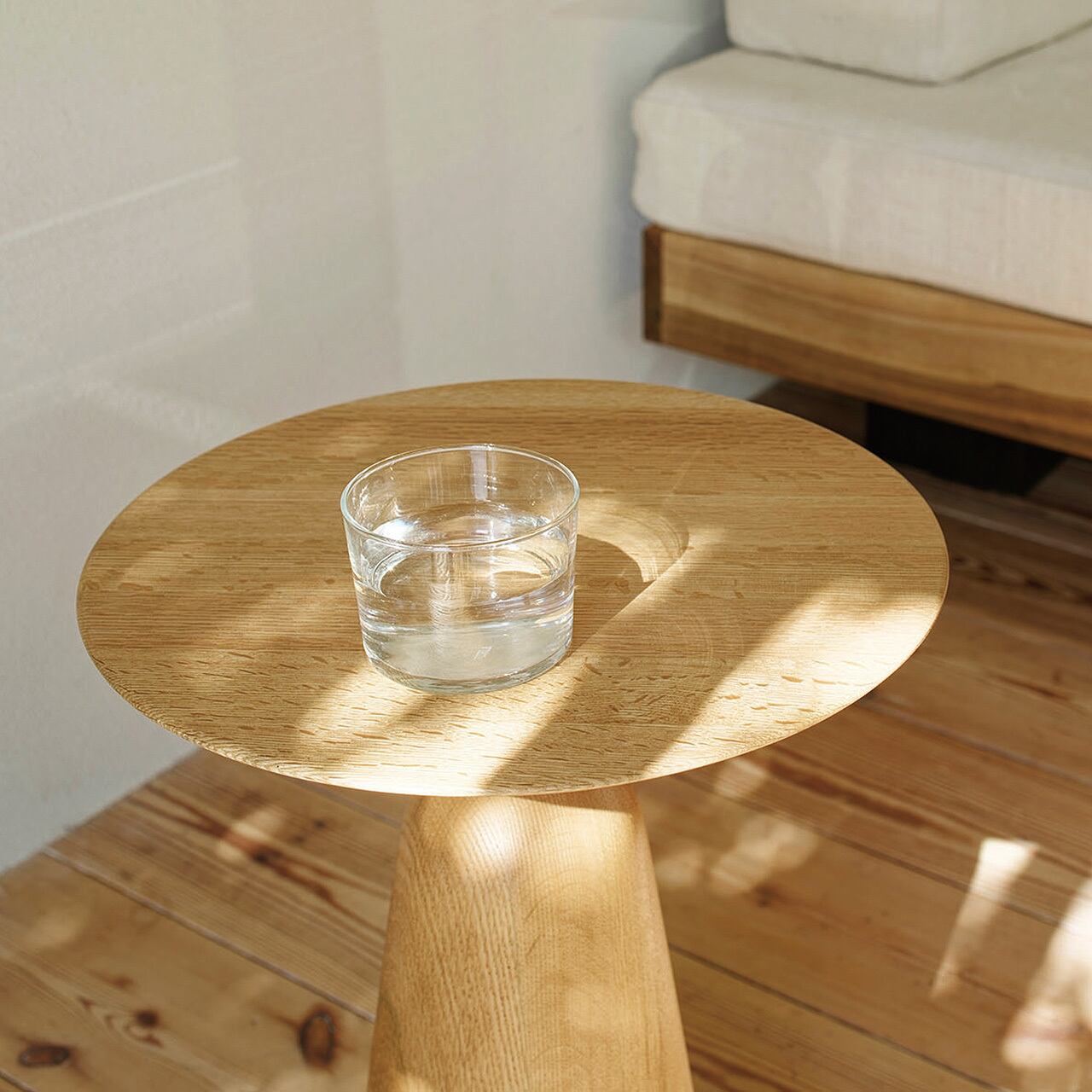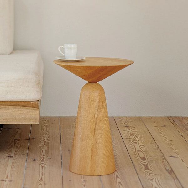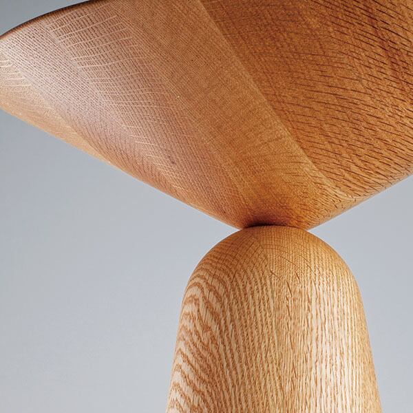 絶妙なバランス感で目を引くのが、円すいの頂点同士で支え合うジオメトリックなシルエット。ミニマルなデザインは和の空間にもしっくりと馴染みます。ゆるやかにつけられたアールによって光が回り込むように反射することで、木の自然な風合いや質感を最大限に引き出し、木目の美しさや豊かさを感じ取ることができます。贅沢に使用されたオーク材の手触りも楽しめ、木の高級感と重厚感がありながらも、収まりのいい低めのサイズ感で落ち着きを与えます。