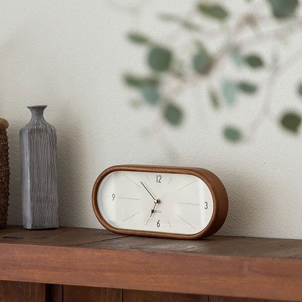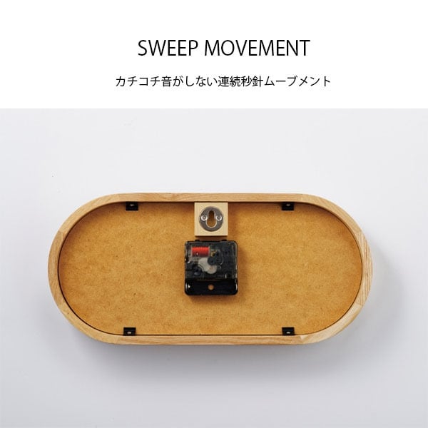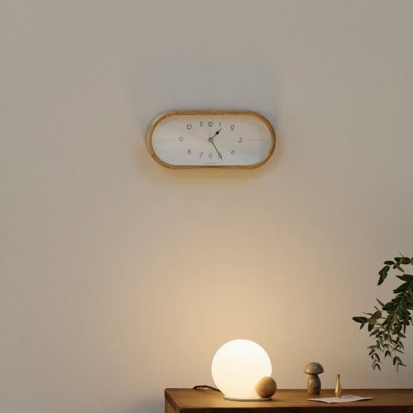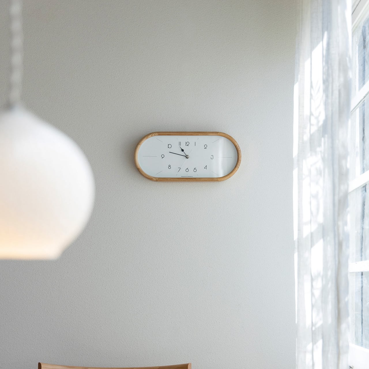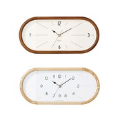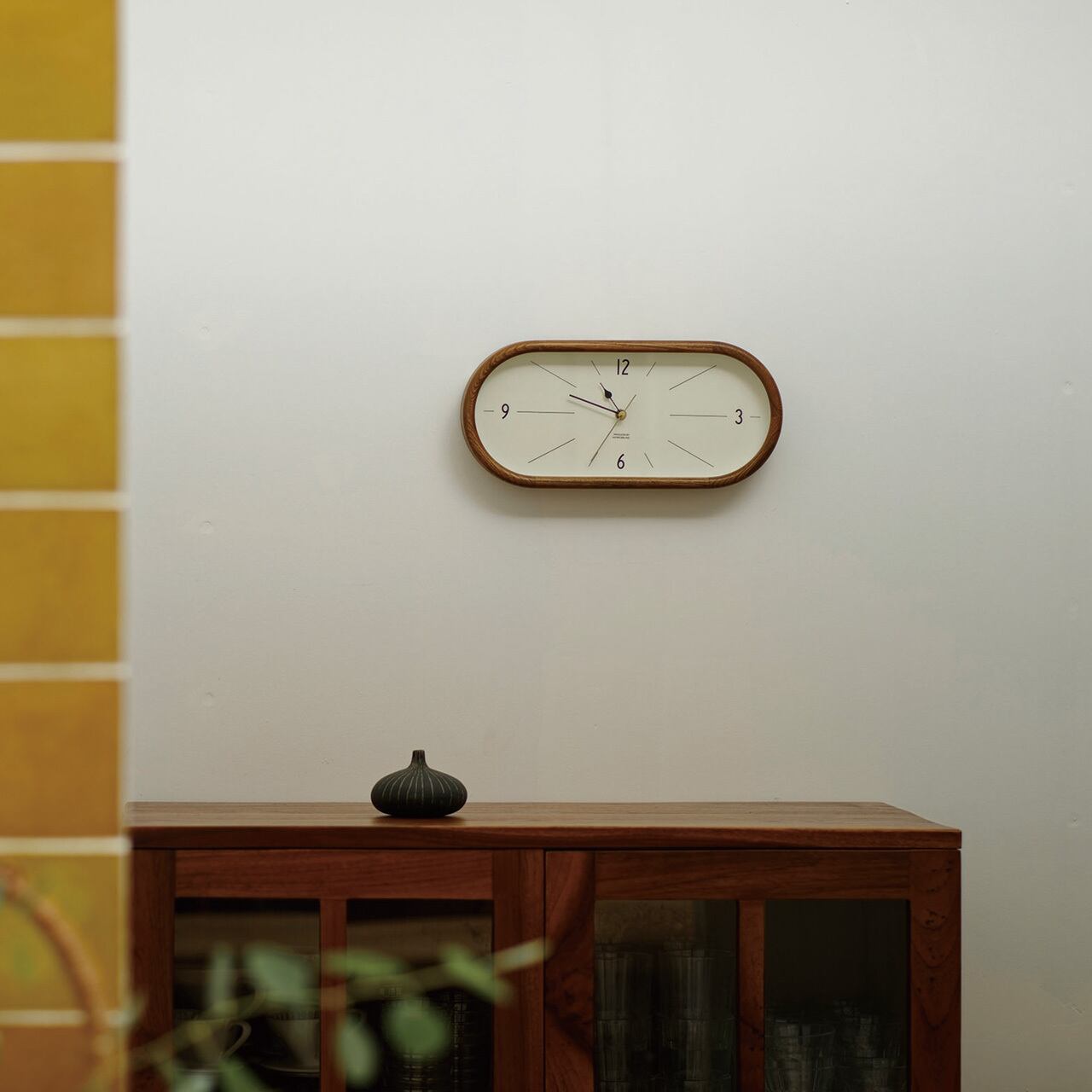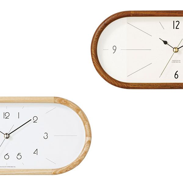 カプセルフォルムを更に横に長くした特徴的なシルエットのウォールクロックです。ウッドフレームの前面に丸みを持たせた丁寧な仕上げと高い加工技術に高級感が感じられます。こちらはカラーによって文字盤のデザインが異なります。ナチュラルは数字が丸く、かわいらしさもありながらすっきりと視認性が高く、無垢なイメージ。ブラウンはアイボリーの文字盤に長めのインデックスを合わせてミッドセンチュリーを感じさせる仕上がりです。