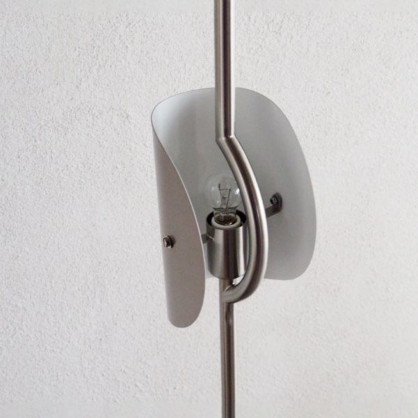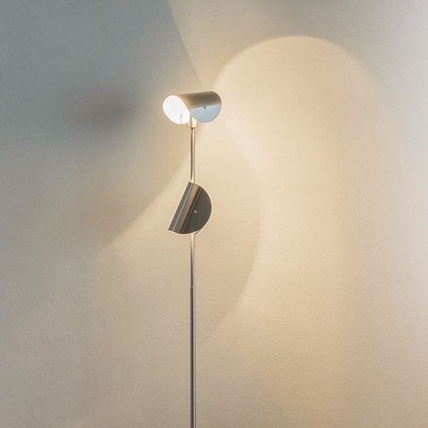 壁に陰影を描いて光で彩るフロアライトは、空間に深みを与え、ドラマチックな変化をもたらします。上下2灯それぞれにつけられた半円状のセードから広がる光が、重なりながら空間に美しい流線型の陰影を生み、幻想的な雰囲気を演出します。そのオムレット型のユニークなフォルムは、光源が直接目に入りにくいだけでなく、光の届け先を選べるので、壁や天井に明かりを広げながら、手元を照らして読書灯にするなど、間接照明としての実用性を高めています。クロームメッキよりも温かみのある色味で、モノトーンやスペースエイジのスタイルに加え、ナチュラルなインテリアにも馴染みがよく、新鮮に映ります。