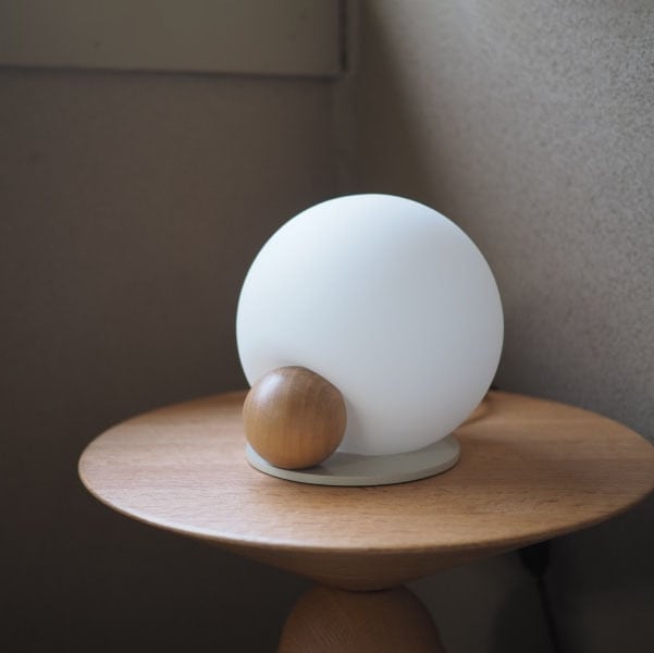 2つのボールが寄り添う、アートオブジェのような丸いフォルムのテーブルライト。ウッドボールに沿うように絶妙なカーブを描くガラスセードがポイント。まるで小さな生き物を柔らかく包み込んでいるような、やさしい姿を連想させます。命が吹き込まれたようなユニークさを持つこのデザインは、眺めていると気持ちがほぐれ、雪のかまくらの中で大切な人と暖を取るような心地よさを感じさせます。