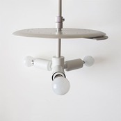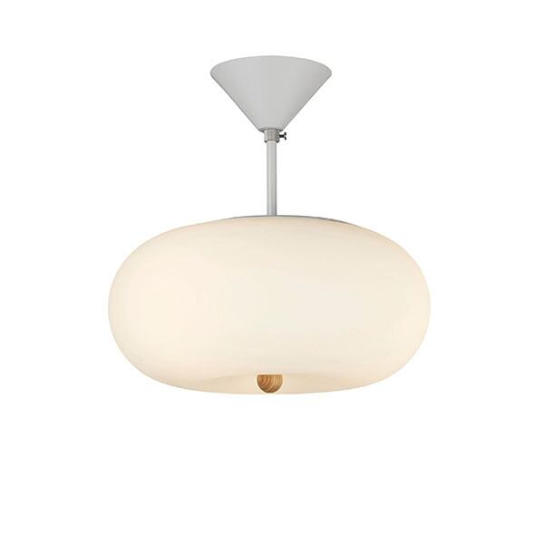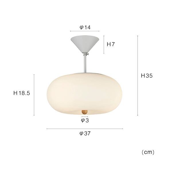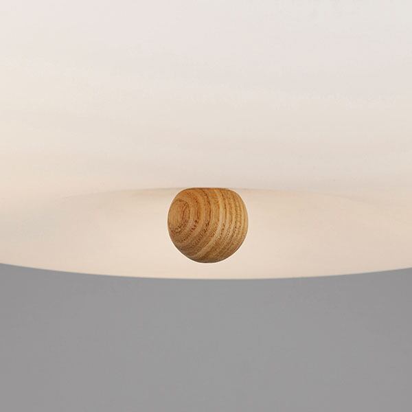 見上げた時の面白さや浮遊感、そして天井との距離感にこだわった、不思議さとかわいらしさが共存したデザインが魅力です。ふんわりと光を広げるホワイトフロストのガラスが柔らかさを感じさせ、雲のような陰影を作り出します。 丸みのあるオーバル型のガラスセードを少しくぼませることで、うっすらと影が落ち、立体感が生まれました。緩やかにくぼんだセードの先端には小さなウッドボールがあしらわれ、ナチュラルなワンポイントになっています。