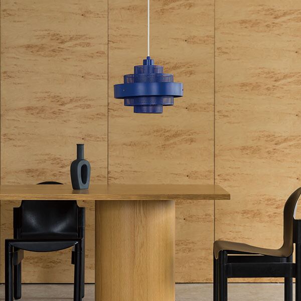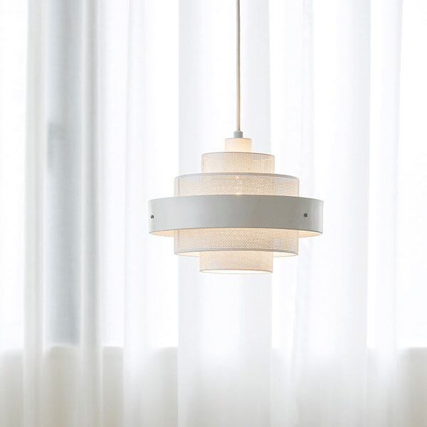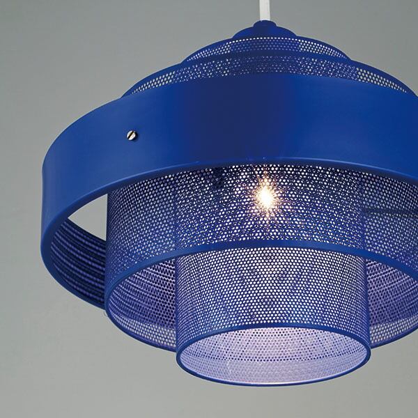 鮮やかな色使いと、パンチングの穴から柔らかく拡散する細やかな光がトレンド感のあるペンダントライト。パンチングセードをレイヤードさせることで、光の透け感を強調し、微細なグラデーションとモアレ効果を生み出します。外側のリングにはパンチングを施さないことで、輪郭をはっきりさせるとともに、グレア(眩しさ)を軽減する工夫がされています。光源を隠すことで、より優れた照明効果を実現しています。普遍的な魅力のある同心円状のデザインとスチールの組み合わせは、シャープでありながら抜け感があり、軽やかな印象です。目の覚めるようなロイヤルブルーと幻想的なトゥルーホワイトの2カラー。