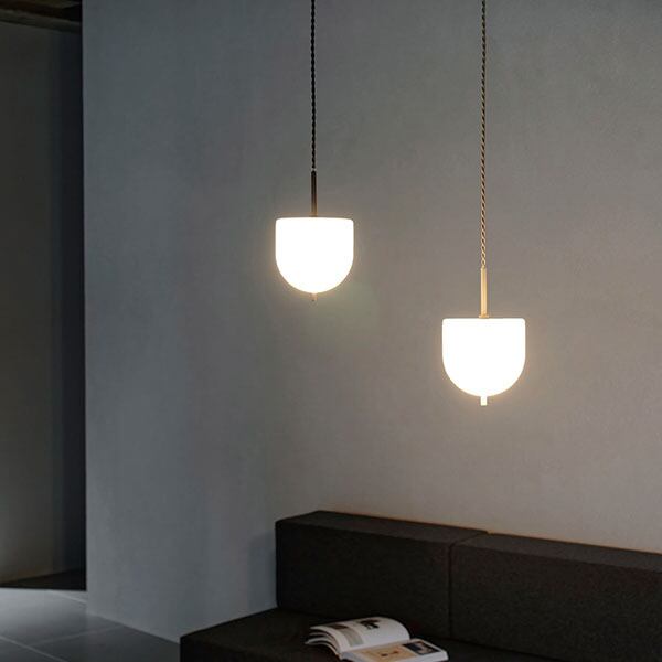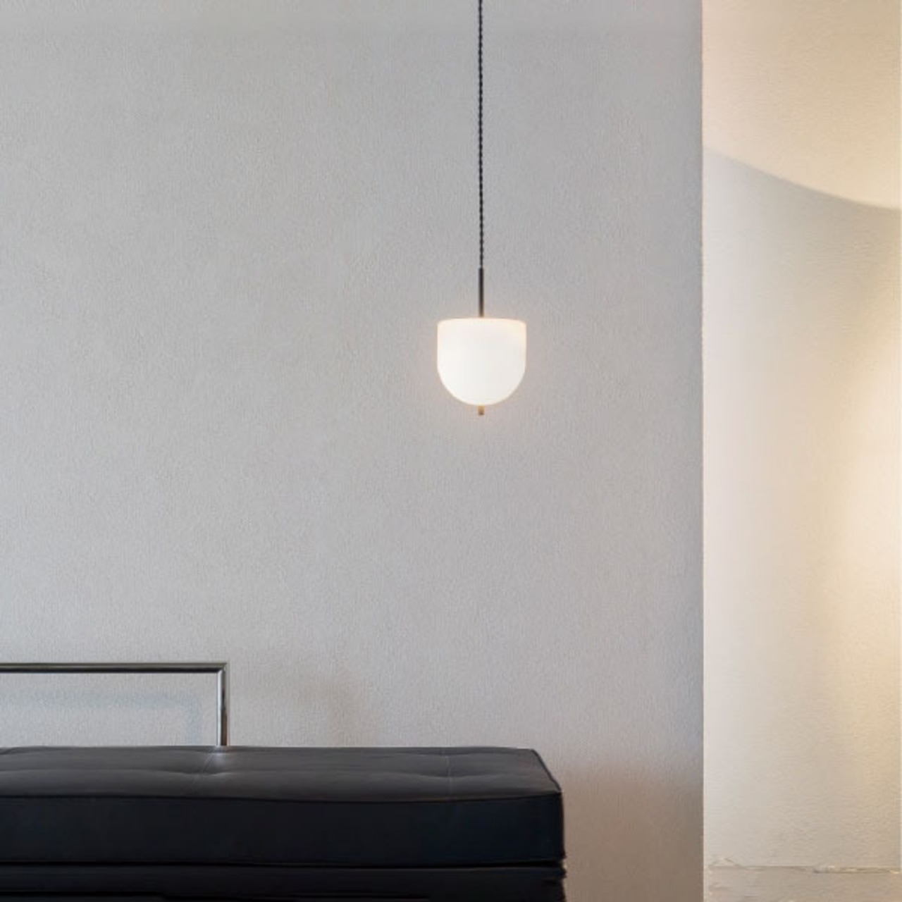 直線的なポールと丸みを帯びたセードを組み合わせた、独楽のように均衡の取れた形状が落ち着きと静けさを感じさせます。ソケットカバーなどの機械的な部分を見せないことでノイズが軽減され、まるで光が空中に浮かんでいるような印象を与えます。柔らかな光が広がるホワイトフロストガラスが眩しさを抑え、優しい灯りを提供します。ニュートラルでモダン、かつシンプルなルックスが空間を引き立てるペンダントライトです。