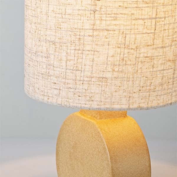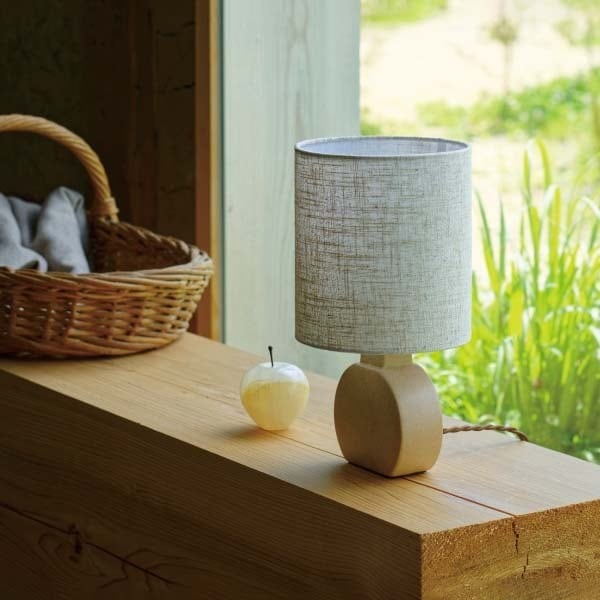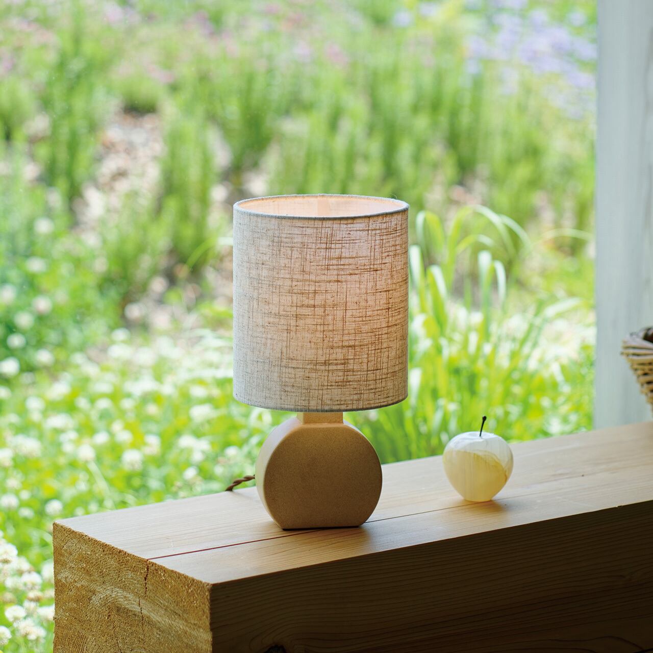 粒が混じった磁器で作られたカフェ食器のような、ほっこりとした質感に居心地の良さを感じるデザイン。前からと横からでフォルムが異なるベースのユニークさが海外インテリアを彷彿とさせます。ベージュトーンの淡い色合いと、麻混合の素朴なファブリックセードが柔らかな光を広げ、周囲をやさしく照らします。べッドサイドやソファーサイドに置いて、くつろぎのひとときを演出したり、オブジェのように飾るのもおすすめです。