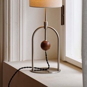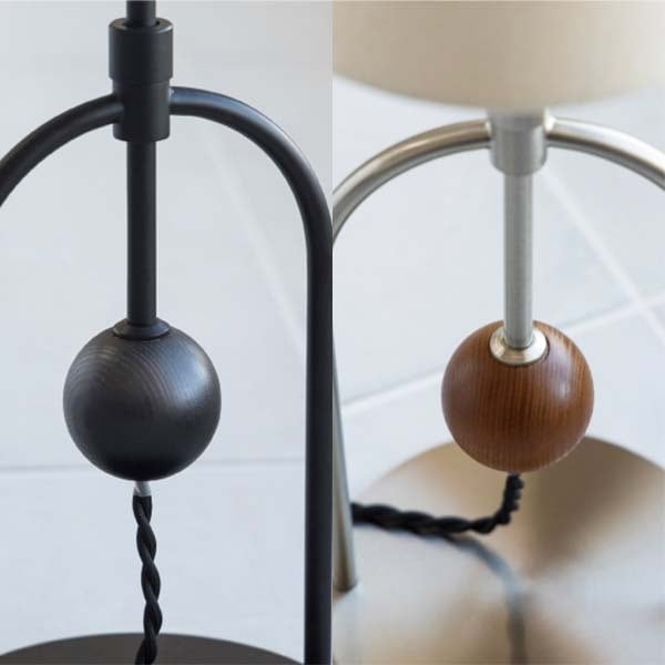 アーチパイプとウッドボールでアクセントを効かせたモダンなデザイン。素材のコントラストをバランスよく取り入れ、抜け感のある洗練された装いに仕上げました。支柱は無段階で高さの調節ができるので、フロアライトとしてベッドサイドや和室など床での暮らしにも寄り添います。厚みのあるファブリックセードから漏れる光があたたかみのある心地よい空間を演出します。ソリッドでシャープなブラックとコントラストの効いたシルバーの2色をご用意。
