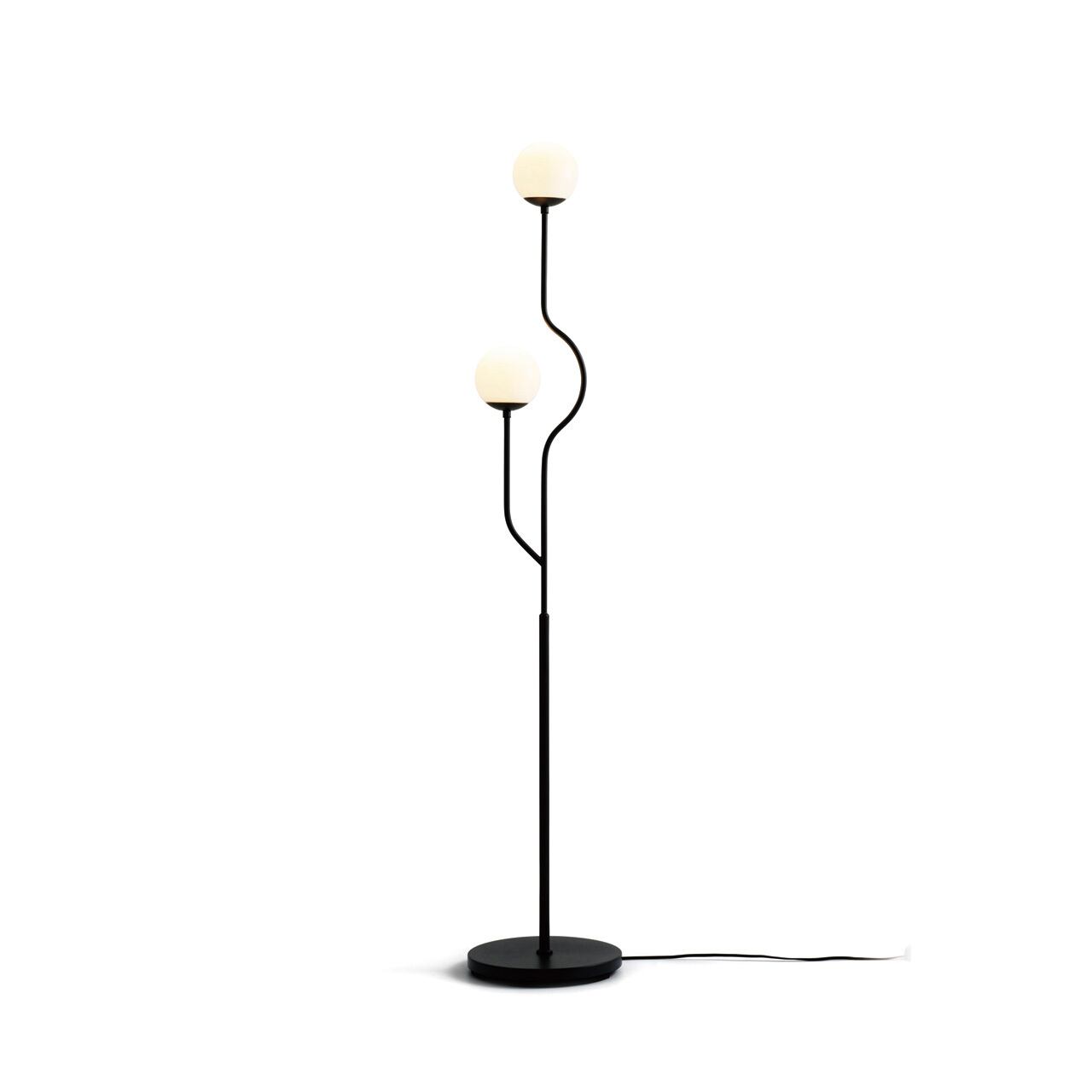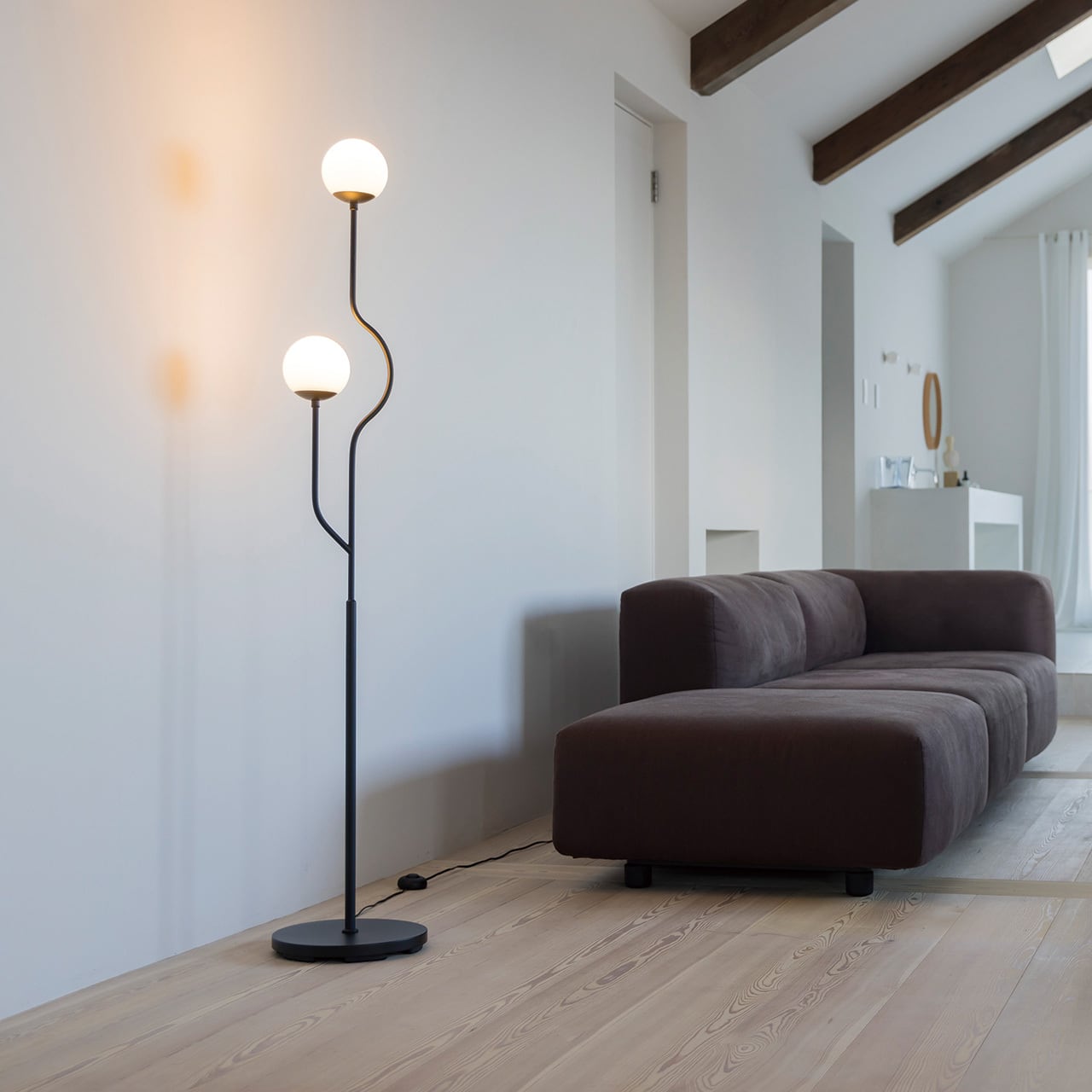 インターフォルムでは珍しい2灯タイプのフロアライト。植物のように枝分かれした形状と、光源を迂回させるラインデザインが特徴です。マットブラックで仕上げたカラーがシャープでモダンな印象を与えつつも、街灯のようなやさしい光を灯します。オブジェのような洗練された佇まいは消灯時にも健在。それ自体がインテリアの重要な要素に。お部屋の雰囲気を変えたい方や個性的な空間づくりをしたい方におすすめです。